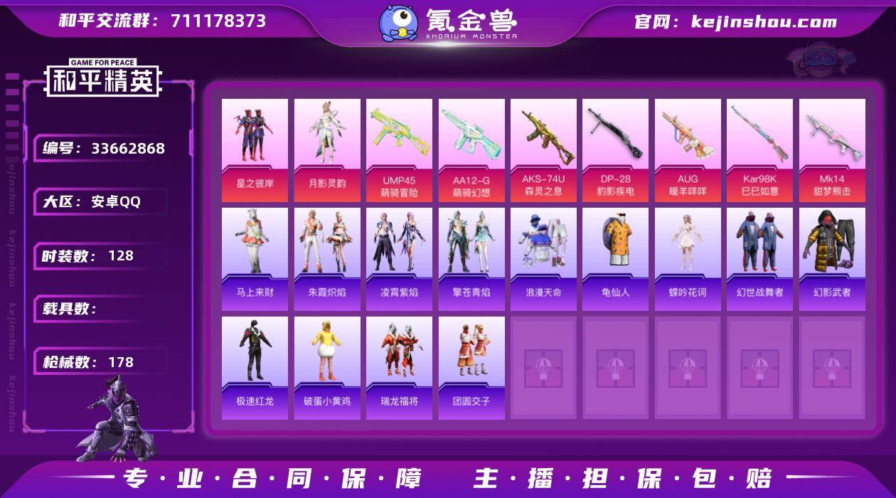 【959356】DYH18170安卓手Q-2粉装-8特效枪-128套装-178枪皮-9王牌印记-不朽星钻Ⅲ-47886热力值【2粉装】角色-月影灵韵,星之彼岸【8特效枪】UMP45-萌骑冒险[5级],Mk14-福马献瑞[5级],AUG-暖羊咩咩[5级],AKS-74U-森灵之息[5级],Mk14-甜梦熊击[5级],Kar98K-巳巳如意[5级],AA12-G-萌骑幻想[5级],DP-28-豹影疾电[5级]【1稀有】浪漫天命【7飞行器】光之冒险尾迹,星之彼岸飞行器,破刃行动尾迹,荒原烈焰飞行器,顶峰精英尾迹,马上有福飞行器,异域银装飞行器【1背包】深海小丑鱼背包【295其它衣服和枪皮】香桃花海,SS21特训,狂鲨锋刃,龙的传人,云朵鹅,SS17特训,SS32特训,灼焰舞者,智慧之神,白糯汤圆,深蓝色名流,王牌教练,SS22特训,湖蓝色名流,蓝色运动,猛禽,雪绒豹,竞技名士,SS38特训,SS29特训,特训学院,缤纷果语,蓝海鲸歌,暗夜傀儡,SS23特训,SS20特训,酒红色名流,SS18特训,幻世战舞者,骑行爱好者,团圆交子,锦灰蝶梦,SS36特训,红釉青花,红色运动,福星高照,战术大师,果汁能量,柠萌假日,黑色伏地魔,元气之梦,夏日音浪,竞技达人朋克,冰川格斗者,人气偶像,街头潮人,角色-蝶吟花词,SS25特训,龙魂突击队,SS19特训,遗迹猎人,完美偶像,音速流光,薄荷星砂,格斗先锋,快乐星愿,SS33特训,海盐绵绵冰,...