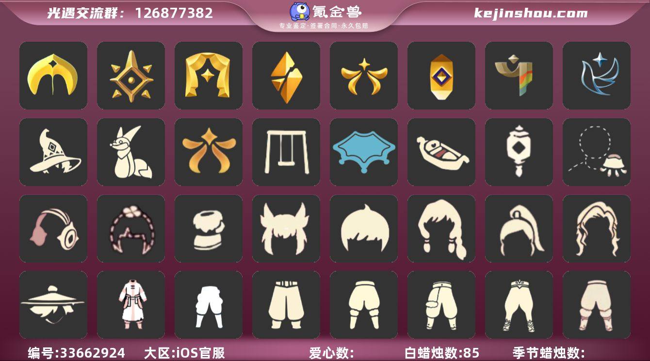 "8季阿努比斯多礼巫师蝙蝠暗彩白枭蛛网欧翼福娃音韵吉他秋千茶桌狐狸 编号:YZ034 区服:苹果 翼数量:90季卡数:9 资源:蜡烛:85爱心:19红蜡 :11 已毕业地图:晨岛 雨林 霞谷 暮土 毕业季节: 圣岛季 预言季 表演季 破晓季 欧若拉季 追忆季 彩染季 青鸟季 热门礼包: 音韵吉他 祥云纸伞 折扇 中秋灯笼 影院套餐 秋千 花憩茶桌 小憩茶桌 狐狸背包 小船 皮皮猫 水晶球 周年抱枕 必胜客披萨 tgc斗篷 王子围巾 欧若拉之翼 新春福娃 衔福献瑞 潮汐斗篷 蝙蝠套装 蛛网斗篷 皮皮猫斗篷 暖冬瑞雪 白雪斗篷 青衫落拓套装 巫师帽 双马尾 蝴蝶与花 橘子 雪花 玉兔 四叶草 小狗发饰 心相印发饰 粽子头饰 小黄鸭头饰 星月王冠 金鳞耳坠 彩虹耳机 圣诞鹿角 优雅领结 水母肩饰 光之生物 雪人暖靴 悦动跑鞋 祥云服饰 暗彩服饰 热门复刻:背带裤 白棉裤 毛靴棉裤 搓澡巾 灯笼裤 紧身棉裤 工装裤 连体衣 武士裤 过膝长袍 狐狸面具 鼬鼠面具 老爷爷面具 星绘面具 玫瑰花面具 书虫 总裁头 正太 高马尾 明制帽 箬笠 花环 虚荣 军帽 爱神 樱花头 单片羽毛 红耳机 飘带耳坠 红金斗 黑金斗 白金斗 蔚紫斗 道袍 小浣熊斗 樱花斗 绿芽斗 海浪斗 彩虹斗 暗彩斗 雨伞 小铲子 女巫茶桌 圣诞板凳",阿努...