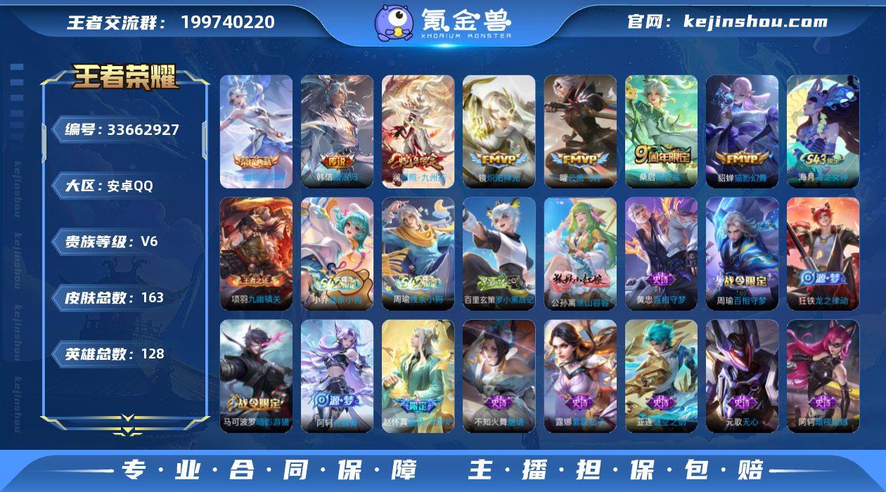 安卓Q-V6-至尊星耀V段位-128英雄-163皮肤-1典藏皮肤-6传说-47史诗 【英雄全皮】:孙权全皮,敖隐全皮,镜全皮,影全皮 【荣耀典藏】:伽罗最初的交响 【传说皮肤】:韩信踏浪归,澜愿照九州拓,桑启鸣野蒿,镜炽阳神光,曜云鹰飞将,貂蝉猫影幻舞 【限定皮肤】:姜子牙天穹之誓,狄仁杰阴阳师,赵云皇家上将,孙尚香蔷薇恋人,元歌无心,马可波罗暗影游猎,狄仁杰魔术师,达摩沙漠行僧,项羽海滩派对,兰陵王金庭之子,李元芳云中旅人,鬼谷子五谷丰年,百里玄策原初追逐者,沈梦溪大漠名商,裴擒虎擒涛扼浪,鲁班大师探海日志,镜匿光追影者,桑启海盐诗旅,艾琳女武神,张良古海寻踪,鬼谷子天穹祈灯,刘邦剑破天穹,镜青焰无极,项羽苍威无极,周瑜熔金海岸 【年限皮肤】:澜愿照九州拓 【赛季限定】:达摩沙漠行僧,兰陵王金庭之子,沈梦溪大漠名商,李元芳云中旅人,桑启海盐诗旅,裴擒虎擒涛扼浪,鲁班大师探海日志,张良古海寻踪,鬼谷子天穹祈灯,刘邦剑破天穹,姜子牙天穹之誓,太乙真人谧流熔炉,钟馗虚灵犬护,甄姬逆浪荇歌,亚瑟荣光之誓,百里玄策原初追逐者,项羽九幽镇关 【战令限定】:马可波罗暗影游猎,镜青焰无极,项羽苍威无极,亚连破空之剑,孙悟空神迹...