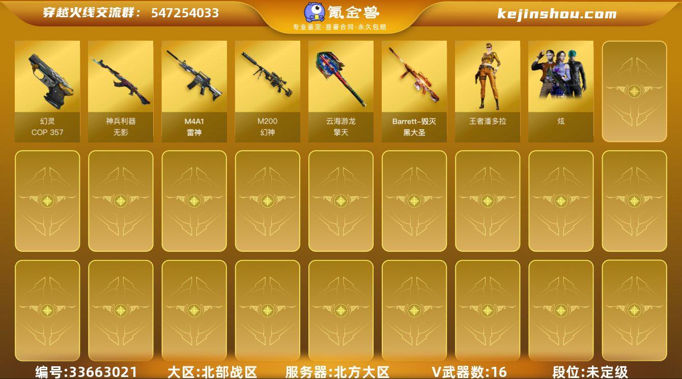 北方大区-17V-0王者武器数-0炫金武器数 【热门武器】:M4A1-青龙,M200-幻神,COP 357-幻灵 【音效卡】:屠龙-电竞之星-竞星跃动音效卡,HK417-朱雀-电竞之星-竞星跃动音效卡 【皮肤】:幻神-冠军之幻,QBZ03-巅峰荣耀皮肤,火麒麟-百城,火麒麟-心动糖果,毁灭-黑大圣皮肤 【角色】:王者潘多拉,云海玲珑,幻面灵狐,暗夜-X,嘉年华灵狐,麻雀,潘多拉-X,斯沃特-X,蜀雪,铁骑荣耀 【人偶武器】:白虎-迷你小艾,AWM-灵狐-15周年嘉年华 【暴走生化】:双面神-竞魂,超级对讲机 【挑战大师】:阐释者III 【英雄级武器】:M4A1-雷神,M4A1-青龙,无影-神兵利器,HK417-朱雀-电竞之星,M200-幻神,COP 357-幻灵,擎天-云海游龙,屠龙-电竞之星,龙啸-烈火龙威,高爆手雷-幻灵,高爆手雷-神工天巧,手雷-云海游龙,闪光弹-幻灵,闪光弹-神工天巧,烟雾弹-幻灵,烟雾弹-神工天巧,AK47-竞魂无影 【其他武器】:源·雷神,魂·M4A1-雷神-化蛇,魂·雷神-神秘按键,魂·雷神-新春神龙,魂-雷神-萌杀,魂·雷神-15周年嘉年华,源·黑骑士*2,魂-死神-机甲核心,魂·龙血-锋芒破茧,金色蔷薇-狼王,源·玫瑰精灵,魂·毁灭-神秘黑洞,魂·Barrett-朱雀- 新春神龙,源·Barrett-朱雀,魂·炼狱-月...