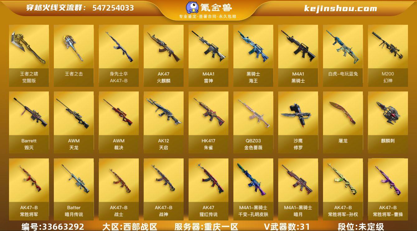重庆一区-36V-5王者武器数-0炫金武器数 【热门武器】:QBZ03-金色蔷薇,HK417-朱雀,M200-幻神,白虎-电玩蓝兔,M4A1-黑骑士,羊驼玩偶,沙鹰-修罗 【王者炫金武器】:王者之击,王者之魄闪光弹 【音效卡】:屠龙-电竞之星-竞星跃动音效卡,M200-幻神音效卡,M4A1-黑骑士音效卡,Barrett-毁灭音效卡,HK417-朱雀-电竞之星-竞星跃动音效卡 【皮肤】:火麒麟-AG战队皮肤,火麒麟-轻羽皮肤,火麒麟-平天大圣,火麒麟-百城,毁灭-星空,毁灭-黑大圣皮肤,M4A1-千变-孔明皮肤,黑骑士-暗月,战神-粉色甜心皮肤,战神-紫绶金章皮肤,AK47-B-常胜将军-曹操*3,AK47-B-常胜将军-刘备,AK47-B-常胜将军-孙权*2 【角色】:幻面灵狐,暗夜-X,北极狐-X,风暴女*2,嘉年华灵狐,娟娟,灵狐者-X,灵狐者-七夕宝贝,灵狐者-职业经理,龙儿,曼陀罗-礼服,潘多拉-X,蜀雪,王者-零-传说之路 【人偶武器】:AWM-灵狐-15周年嘉年华,闪光弹-貂蝉,高爆手雷-大乔,迷你超能女侍 【暴走生化】:超级对讲机 【英雄级武器】:AK47-火麒麟,M4A1-雷神,M4A1-黑骑士,AK12-天启,HK417-朱雀,QBZ03-金色蔷薇,AK-47-猩红传说,AK47-B-战神*2,黑骑士-海王,AK47-B-常胜将军,王者白虎-觉醒版,白虎-电...