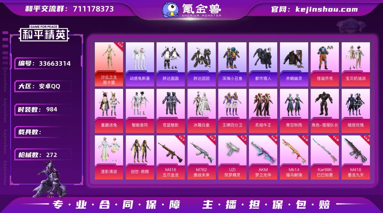 精氪素材号/ss22战神框【图卡盟/小丑/都市/赤蝎】深海小丑鱼/浪漫天命/胖达/金羽特工/罗小黑/战队服/智能音符/满级激战未来/6级ak梦之光华/三级p90沙丘之主/小熊背包/10w热力值 实名: 可修改 时装数: 984 枪械数: 272 战备数: 207 神级装扮: 沙丘之主-图卡盟 热门装扮: 怪诞乔克,深海小丑鱼,宝贝奶油派,迅捷狂鲨,鹰眼刺客,智能音符,都市猎人,狮王雄心,苍蓝魅影,冰霜白皇,王牌四分卫,童趣迷兔,暗夜玫瑰,炙焰牛王,激萌罗小黑,胖达团团,胖达圆圆,动感兔斯基,青空秋雨,赤蝎幽灵,猩猩队长,暗夜魅影,莲影清波,创世·救赎 稀有枪皮: AKM炫紫旋律,M416五爪金龙,M762激战未来,AKM梦之光华,UZI筑梦精灵,P90沙丘之主,M416墨龙九天,莫辛纳甘-未来领航者,Kar98K-巳巳如意