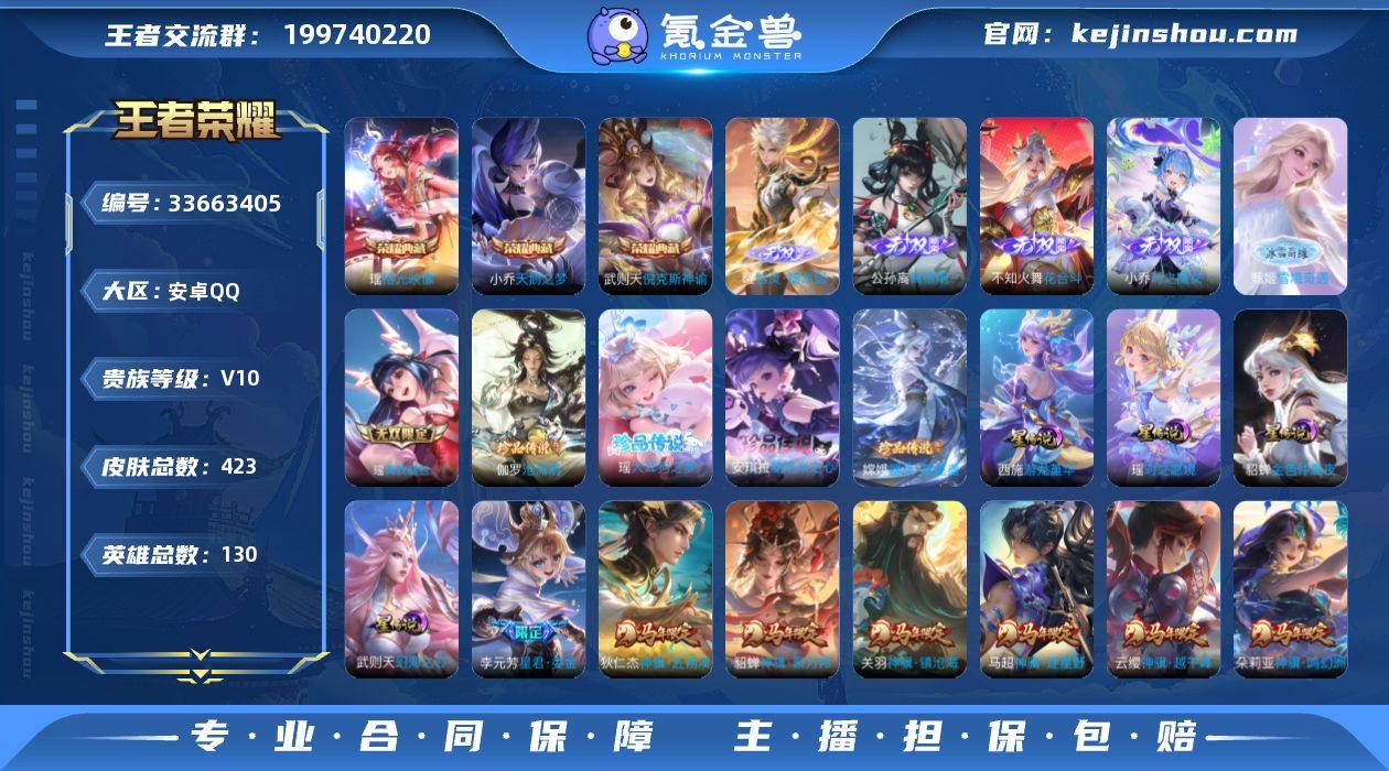 V10 极品女号百星印记17王者印记金标1.1w西施,金标甄姬5星传说大乔沐霞之诺,瑶时之愿境,西施游龙堇华,武则天幻海之心,貂蝉金色仲夏夜19个性按键3天幕 安卓Q-V10-最强王者段位-130英雄-423皮肤-3典藏皮肤-1典藏英雄-6无双-4珍品传说-48传说-133史诗 【英雄全皮】:小乔全皮,朵莉亚全皮,瑶全皮,嫦娥全皮,海月全皮,少司缘全皮 【荣耀典藏】:武则天英雄,武则天倪克斯神谕,小乔天鹅之梦,瑶拾光映像 【无双皮肤】:曜器灵螭龙剑,甄姬雪境奇遇,公孙离离恨烟,不知火舞花合斗,小乔时之魔女,瑶真我赫兹 【珍品传说】:伽罗沧流箭,安琪拉酷洛米之心,瑶大耳狗之梦,嫦娥器灵落星盏 【传说皮肤】:云缨神骥越千峰,关羽神骥镇沧海,朵莉亚神骥鸣幻洲,狄仁杰神骥赴朔漠,貂蝉神骥聚万邦,马超神骥逐星野,李元芳星君娄金,后羿神树通天,干将莫邪千山共赴,元歌诡秘之主,蔡文姬愿照福禄聚,桑启鸣野蒿,朵莉亚心动手记,海月金乌负日,澜逐花归海,艾琳觅芳踪,露娜霜月吟,甄姬至美化雀舞,大乔时之奇旅,东皇太一灼幽烈阳,小乔山海琳琅生,王昭君星穹之声,大乔挚爱花嫁,瑶时之祈愿,貂蝉遇见胡旋,王昭君乞巧织情,西施游龙清影,曜李逍遥 ,周瑜音你心动,小...