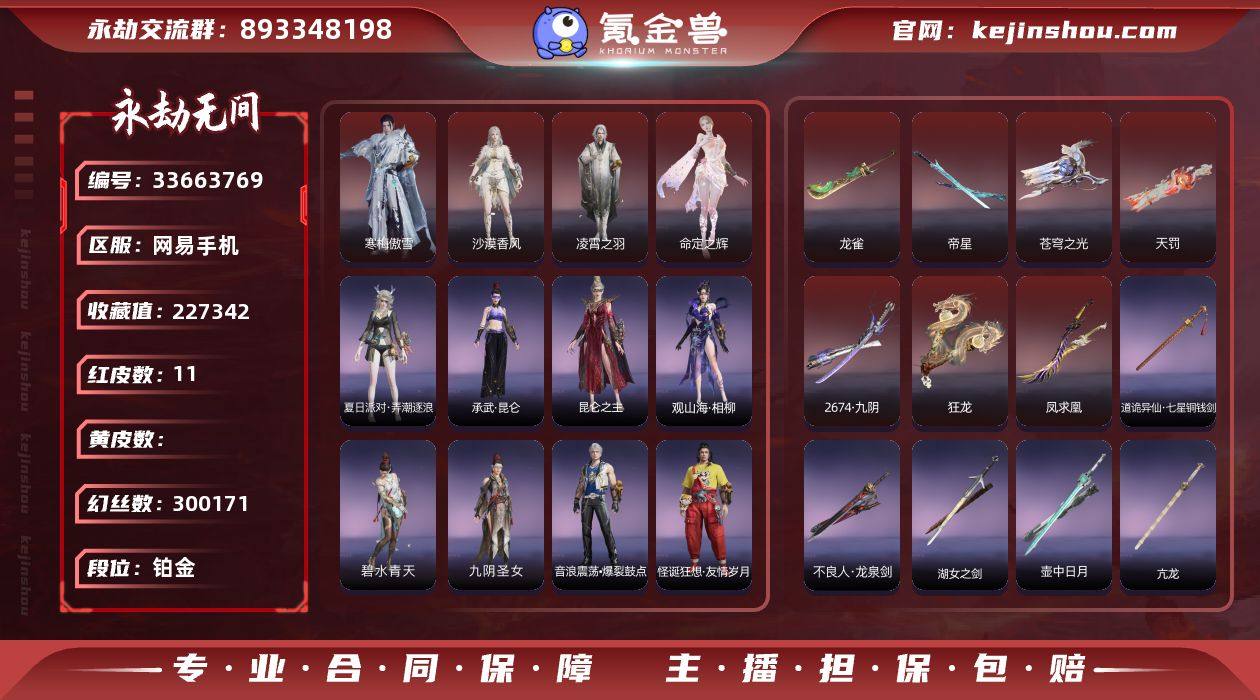 "【红皮】:沙漠香风(迦南皮肤),凌霄之羽(无尘皮肤),凤求凰(双刀皮肤),狂龙(双节棍皮肤),2674·九阴(太刀皮肤),天罚(火炮皮肤),苍穹之光(五眼铳皮肤),帝星(横刀皮肤),龙雀(阔刀皮肤),寒梅傲雪(李寻欢皮肤),命定之辉(席拉皮肤) 【外观总数】11红 365 金 幻丝:300171金砖: 收藏值:22W 【段位】:单排: 双排: 三排: 【换绑】:可换绑,期间登录网易大神不影响正常游戏,其他皮肤可参考以下截图,道具、段位以实际验号为准,段位因赛季原因发生变化,以上号为准"""