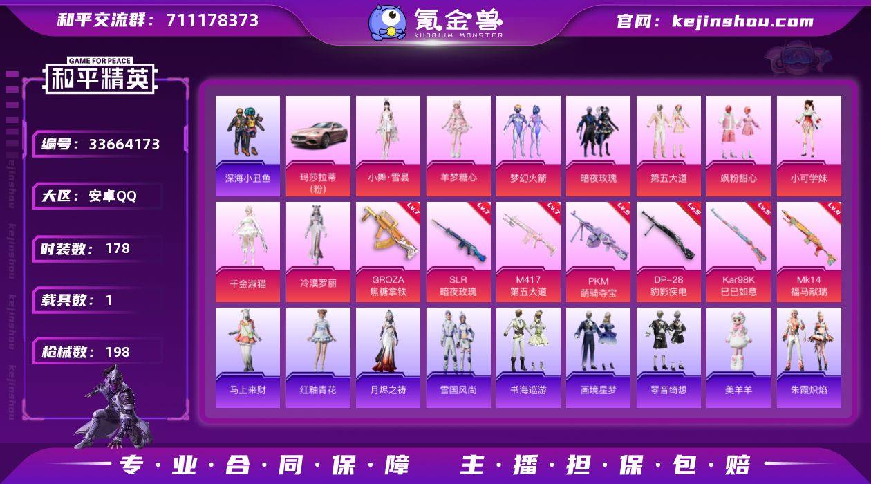 安卓 手Q-9粉装-7特效枪-1载具-0粉色飞行器-66598热力值-7王牌印记-178套装-198枪皮 【热门品类】:粉装-梦幻火箭,套装-浪漫天命,套装-深海小丑鱼,套装-龟仙人,套装-粉红小猪 【粉色套装】:粉装-梦幻火箭,粉装-暗夜玫瑰,粉装-第五大道,粉装-飒粉甜心,角色-小可学妹,角色-千金淑猫,角色-冷漠罗丽,角色-羊梦糖心,人物-小舞·雪昙 【粉色枪皮等级】:GROZA-焦糖拿铁(七级),Kar98K-巳巳如意(五级),Mk14-福马献瑞(四级),SLR-暗夜玫瑰(七级),M417-第五大道(七级),DP-28-豹影疾电(五级),PKM-萌骑夺宝(五级) 【粉色载具】:玛莎拉蒂Ghibli(粉) 【粉色枪皮】:GROZA-焦糖拿铁,Kar98K-巳巳如意,Mk14-福马献瑞,SLR-暗夜玫瑰,M417-第五大道,DP-28-豹影疾电,PKM-萌骑夺宝 【粉色降落伞】:梦幻火箭降落伞,神秘黑猫降落伞,暗夜玫瑰降落伞,焦糖拿铁降落伞,彩虹甜喵降落伞,第五大道降落伞,未来歌姬降落伞,千金淑猫降落伞,月影灵韵降落伞,鬼刀降落伞,奇迹舞步降落伞,炫彩糖果降落伞 【稀有套装】:套装-龟仙人,套装-绒宝小鹅,套装-巳巳如意,套装-雪国风尚,套装-马上来财,角色-都市丽猫,角色-摩登魅猫,套装-燕燕于飞,套装-鱼渊荷华,角色-风玲,套...