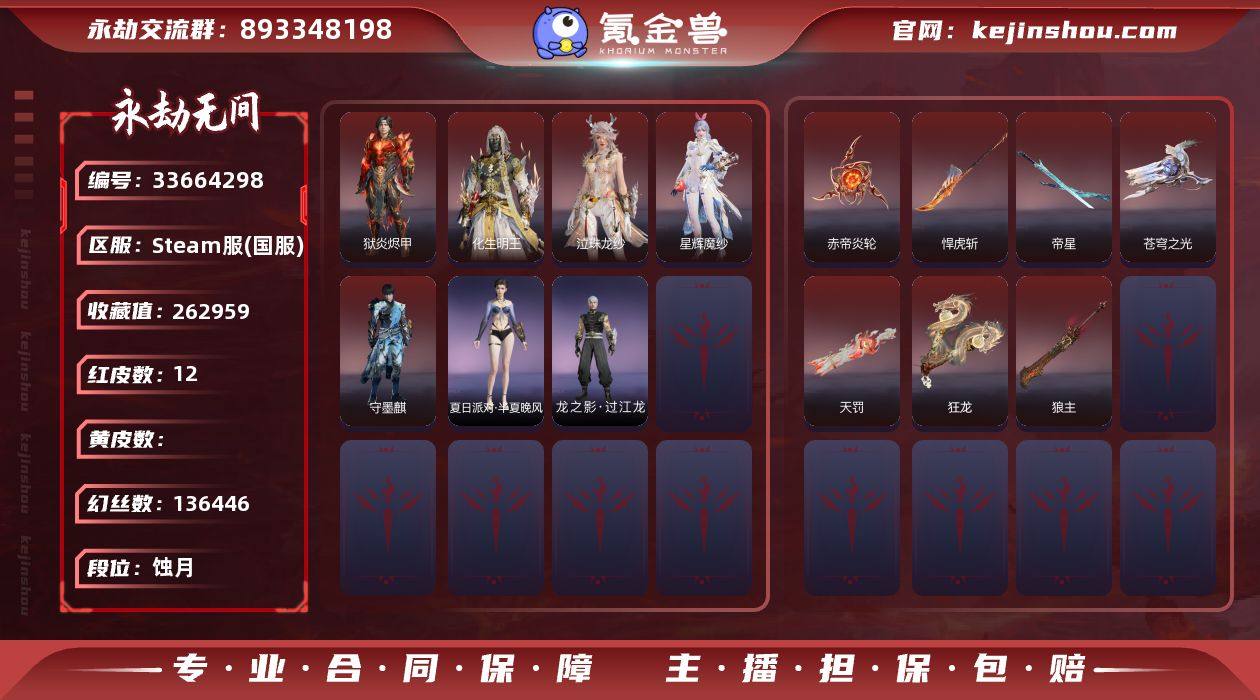 WJ6198,steam端游,可换绑,12红396金,等级299,收藏值262959,三人段位蚀月5,幻丝136446,金砖20,通行证Lv.4,声望2,雪霜姿,神乌造像,红色神品,星辉魔纱,守墨麒,化生明王,狱炎烬甲,泣珠龙纱,天罚,苍穹之光,赤帝炎轮,帝星,狼主,悍虎斩,狂龙,角色金色皮肤,倒反阴阳狐踪,黄庭道,梨园传奇柳生,封神录申公豹,司天命,墨染千秋剪春漪,禄运玉霄,封神录龙吉公主,赤丹朱湛,击浪,花之倾奇,赤翎之约,浣烟纱,瀚海苍鹰,福瑞天泽,葫芦兄弟蛤蟆头领,封神录妲己,黄昏巫主,云溪仙子,绿野守护悠竹萌客,街头狂欢涂鸦少女,绮云衫,观山海腓腓,塔罗序衔环,夜绸袍,观山海文鳐,夏日派对半夏晚风,金财聚辉,封神录姜子牙,云间影,绿野守护山漠狞影,雪铃绮歌,斩神林七夜,武道无穷少林,墨染千秋青玉案,开辟鸿蒙风雨谐,智绘萍之缘,新倩女幽魂瑶光沐月,怪诞狂想致命玩笑,斗罗大陆唐三,巫师3杰洛特,信手斩龙,观山海相柳,夜华朝,魔杰傲昆仑,红川仙子,碧水青天,瑞火麟,逆水寒江海沧澜,游四海,长歌诗韵遣唐使,春桃笑,清雅少女,九阴圣女,妖刀姬,绿野守护暗沼摩罗,阿娜希塔,龙之影过江龙,