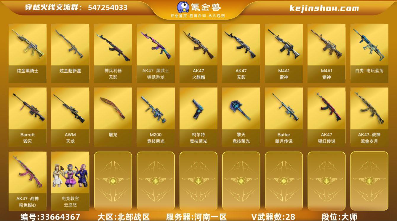 【ky7007】河南一区-29V-1王者武器数-2炫金武器数 【热门武器】:M200-竞技荣光,白虎-电玩蓝兔,裁决-雪莉杨,USP-雷暴 【王者炫金武器】:王者之魄闪光弹,炫金骑士,炫金超新星 【皮肤】:毁灭-英雄计划 皮肤,战神-粉色甜心皮肤*3,战神-流金岁月皮肤 【角色】:电竞教官-云悠悠,暗夜-X,芳心审判者,虎妞,嘉年华灵狐,娟娟,葵-赛博朋克,猎狐者-追月,灵狐者-X,龙儿,潘多拉-X,斯沃特-X,新娜塔莎,游珑儿 【人偶武器】:裁决-雪莉杨,火麒麟-灵狐,AWM-灵狐-15周年嘉年华*2,生化手雷-机甲核心,迷你超能女侍,灵狐娃娃手雷 【暴走生化】:黑龙吞噬者 【挑战大师】:冰龙粉碎者-白马银枪 【英雄级武器】:AK47-火麒麟,M4A1-雷神*2,AK47-无影,无影-神兵利器,黑武士-锦绣游龙,M4A1-猎神,AK-47-猩红传说*2,白虎-电玩蓝兔,AWM-天龙,Barrett-毁灭,M200-竞技荣光,Barrett-暗月传说*3,USP-雷暴,柯尔特-竞技荣光,屠龙,擎天-竞技荣光,高爆手雷-竞技荣光*2,闪光弹-竞技荣光*2,闪光弹-神工天巧,烟雾弹-竞技荣光*2 【其他武器】:源·火麒麟*6,魂·火麒麟-百城,御·黑龙-龙太子,源·雷神*5,魂·雷神-维纳斯,魂·雷神-新春神龙*2,魂-雷神-萌杀,魂·雷神-15周...