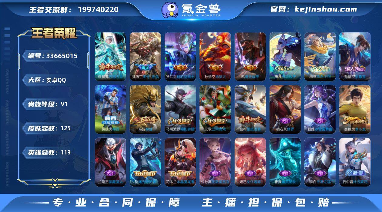 有二次 安卓Q-V7-尊贵铂金I段位-113英雄-125皮肤-5传说-32史诗 xs264189 【传说皮肤】:诸葛亮时雨天司,铠绛天战甲,孙悟空零号赤焰,孙悟空地狱火,狄仁杰超时空战士 【限定皮肤】:狄仁杰阴阳师,赵云皇家上将,墨子神迹守卫,高渐离死亡摇滚,阿轲迷踪丽影,芈月重明,吕布御风骁将,周瑜赤莲之焰,元歌云间偶戏,夏侯惇朔风刀,曹操烛龙,典韦穷奇,马可波罗暗影游猎,狄仁杰魔术师,狄仁杰万华元夜,达摩星际陆战队,达摩沙漠行僧,项羽海滩派对,老夫子醍醐杖,程咬金演武夺筹,刘邦夺宝奇兵,兰陵王驯魔猎人,亚瑟潮玩骑士王,孙悟空至尊宝,孙悟空零号赤焰,牛魔御旌,雅典娜单词大作战,太乙真人饕餮,鬼谷子原初探秘者,诸葛亮时雨天司,苏烈千军破阵,弈星混沌棋,明世隐疑决卦,裴擒虎李小龙,狂铁御狮,米莱狄御霄,云中君纤云弄巧,盾山御銮,猪八戒西部大镖客,上官婉儿梁祝,蒙犽狂想玩偶喵,裴擒虎梅西 【年限皮肤】:诸葛亮时雨天司,吕布御风骁将 【赛季限定】:太乙真人饕餮,曹操烛龙,芈月重明,典韦穷奇,狂铁御狮,米莱狄御霄,牛魔御旌,盾山御銮,夏侯惇朔风刀,弈星混沌棋,明世隐疑决卦,老夫子醍醐杖,鬼谷子原初探秘者,狄仁杰万华元夜,程咬...