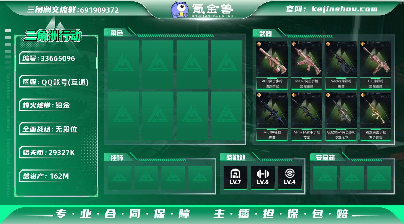 【959396】162m总资产-29327k哈夫币-60烽火等级-铂金-1战场等级-无军衔 【近战皮肤】:近战-黑鹰 【传说外观】:QBZ95-1突击步枪-凌霄戍卫,AUG突击步枪-悠然茶歇,腾龙突击步枪-万金泪冠,MK47突击步枪-悠然茶歇,Vector冲锋枪-夜莺,UZI冲锋枪-悠然茶歇,勇士冲锋枪-万金泪冠,MK4冲锋枪-夜莺,Mini-14射手步枪-夜莺,M14射手步枪-缄花,SKS射手步枪-骑士,SR-25射手步枪-缄花,AWM狙击步枪-万金泪冠,.357左轮-缄花 【史诗外观】:K416突击步枪-冬日风情,K416突击步枪-阿萨拉特攻,AUG突击步枪-蝮蛇,MP5冲锋枪-竞技风,MP7冲锋枪-六套之力,PKM通用机枪-蝮蛇,QJB201轻机枪-炽焰,M14射手步枪-工业狂潮,M700狙击步枪-竞技风,沙漠之鹰-曙光 【稀有外观】:AUG突击步枪-旧梦,AKM突击步枪-肃杀,K416突击步枪-一帆风顺,SG552突击步枪-2026,SG552突击步枪-贴花艺术, AK-12突击步枪-马年新春,SCAR-H战斗步枪-荣耀列队,MP5冲锋枪-哈夫克卫队,Vector冲锋枪-先锋,SMG-45冲锋枪-行动开启,SMG-45冲锋枪-幻影结构,勇士冲锋枪-冰天雪地,QCQ171冲锋枪-银鹭,M249轻机枪-冰天雪地,Mini-14射手步枪-荣耀列队,SV-98狙击步枪-星链科技,SV-98狙击步枪-哈夫克航天,SV-98狙...
