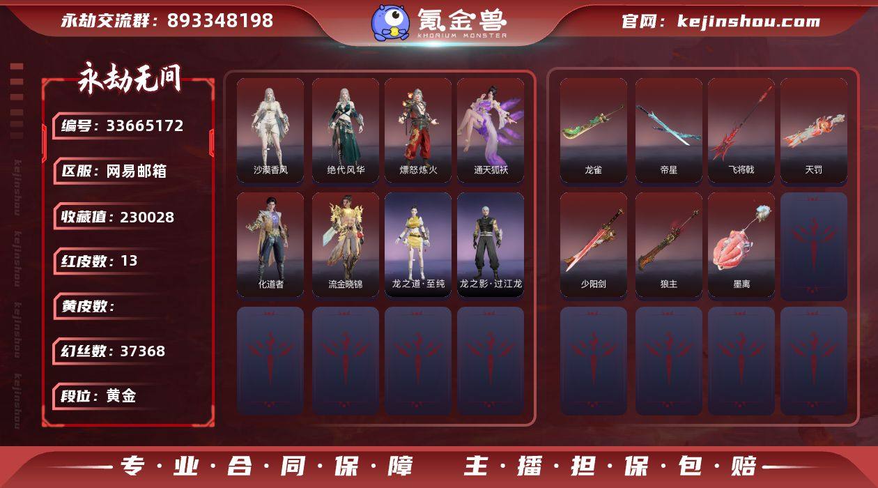 WJ6202,网易邮箱,5月19日可换绑,13红350金,网易支付无法注销,等级392,收藏值230028,三人段位黄金2,幻丝37368,金砖740,通行证Lv.1,声望10,红色神品,墨离,绝代风华,沙漠香风,通天狐袄,化道者,流金晓锦,熛怒炼火,天罚,龙雀,狼主,飞将戟,少阳剑,帝星,角色金色皮肤,P5R雨宫莲JOKER,封神录申公豹,司天命,若谷,寒烟素,祸津素盏,麟鹿大铠,花之倾奇,倾国倾城闭月,倒反阴阳凛冬,龙门飞天,观山海秋神蓐收,炽火照夜,观山海冬神玄冥,春不敛,赤阳天狐,护世四法广目天王,黄昏巫主,P5R奥村春NOIR,天工奥妙,长歌诗韵念奴娇,寿竹云春,赤诚心,赤焰战灵,古冢行,天虹咏,开辟鸿蒙日月明,长歌诗韵如梦令,狩猎都市雷行猎手,觉明尊者,冬日绮韵白熊,梨园传奇法海,觉之一念,八宝龙王,甜夜安眠鹅黄纱梦,智绘萍之缘,新倩女幽魂瑶光沐月,怪诞狂想街头梦语,追猎,不良人李星云,长歌诗韵鹧鸪天,逆水寒江海沧澜,耀世魂花,紫金玉女,红川仙子,碧水青天,九阴圣女,巅峰极速小可,山吹茶,龙之道至纯,天钿女命,御宅罗梦,御宅花织,清雅少女,贵胄少女,狩猎都市暗夜利刃,阴阳师灼舞桃节,妖刀姬,汐泪,观山海精卫,倒反阴阳铁面,新...