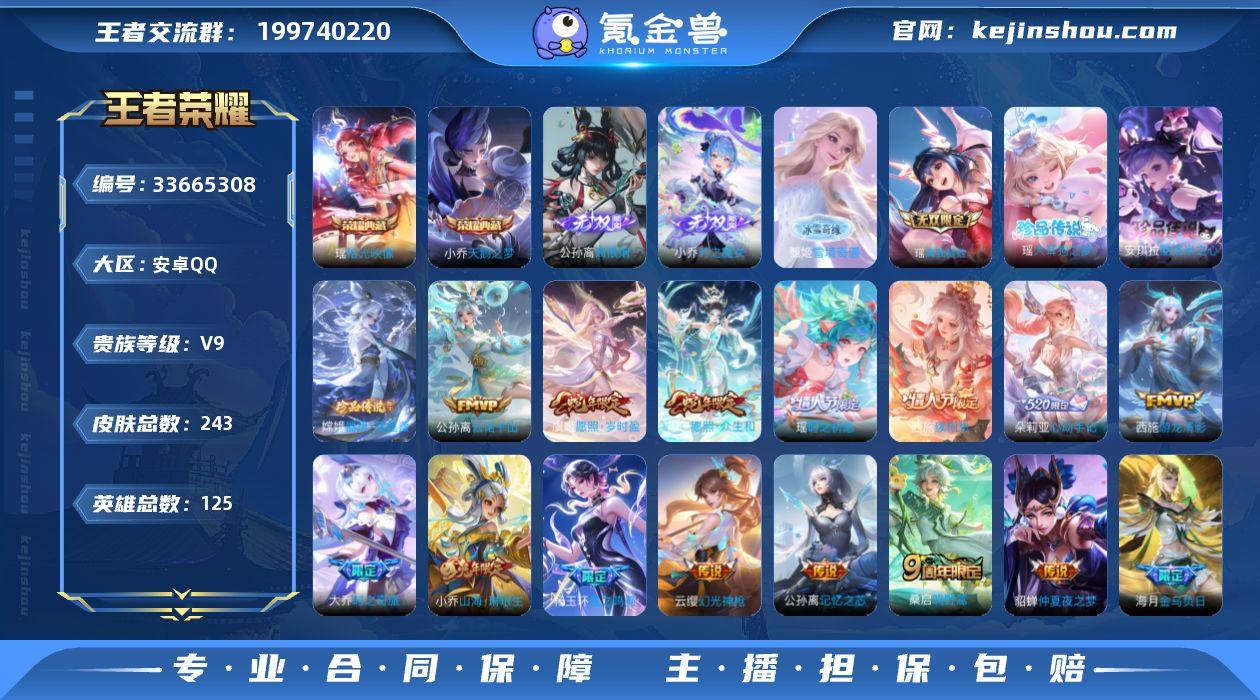 125英雄-243皮肤-安卓QQ/可二次/v9高质量女号差六千四v10/全皮瑶西施/小乔差情限全皮/2星传说/永恒钻石/243皮肤/125英雄/3典藏/4无双/3珍品传说/23传说/81史诗/6稀有英雄 【3 珍品传说】酷洛米之心 安琪拉,大耳狗之梦 瑶,器灵·落星盏 嫦娥, 【3 典藏皮肤】天鹅之梦 小乔,颠倒童话·魔镜 安琪拉,拾光映像 瑶, 【4 无双皮肤】雪境奇遇 甄姬,时之魔女 小乔,真我赫兹 瑶,离恨烟 公孙离, 【23 传说皮肤】启明星使 虞姬,时之祈愿 瑶,游龙清影 西施,仲夏夜之梦 貂蝉,神骥·鸣幻洲 朵莉亚,神骥·聚万邦 貂蝉,记忆之芯 公孙离,海洋之心 武则天,乞巧织情 王昭君,音你心动 小乔,山海·琳琅生 小乔,时之奇旅 大乔,挚爱花嫁 大乔,星之鸣奏 杨玉环,金乌负日 海月,心动手记 朵莉亚,愿照·众生和 妲己,神树通天 后羿,幻光神枪 云缨,愿照·岁时盈 虞姬,鸣野蒿 桑启,云诺千山 公孙离,续相思 西施, 【81 史诗皮肤】时之奇旅 安琪拉,末日机甲 吕布,紫霞仙子 露娜,白鹤梁神女 大乔,猫狗日记 大乔,德古拉伯爵 刘邦,心灵战警 亚瑟,银翎春语 杨玉环,诗语江南 西施,无心 元歌,巫礼祀神 少司缘,鬼剑武藏 宫本武藏,百相守梦 黄忠,幻珠鲛人 朵莉亚,至美·乘鲤谣 西施,无限星赏官 公孙离,瓦猫非猫 太乙真人,线条小...