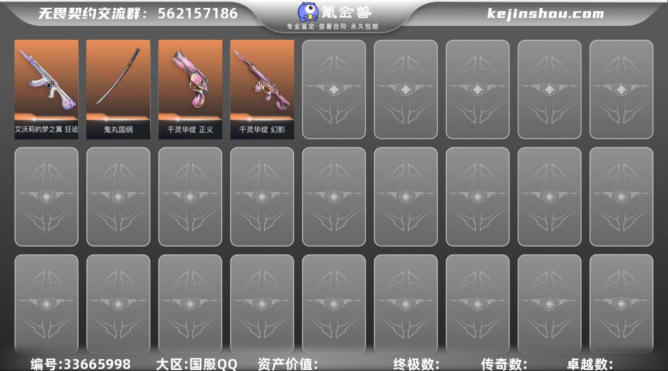 7橙皮 1金皮 2紫皮 34皮肤 26英雄 57卡面 455已用源晶 未定级段位 可二次 可修改实名 【近战武器皮肤】鬼丸国纲,荒土机兵热能刀,爪刀-RGX 11z Pro 3.0 【佩枪皮肤】正义-千灵华绽 【步枪皮肤】狂徒-混沌序曲,狂徒-洪荒怒焰,狂徒-艾沃莉的梦之翼,狂徒-盖亚的复仇,幻影-千灵华绽 【狙击枪皮肤】冥驹-堕天遗武 【挂饰】无畏契约GO!第一卷芮娜挂饰,无畏契约GO!第一卷零挂饰,终章KO小金人挂饰,第九季超凡挂饰,V25第三幕超凡挂饰,双城之战小蛋糕挂饰,双城之战魄罗挂饰,神中神挂饰,袖珍捷风挂饰