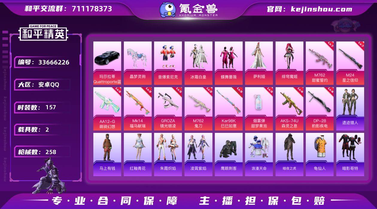 【LHPX2577】【14印记精品搭配暗夜之虎哥特满级m762满级m24玛莎拉蒂 马皮肤】安卓 手Q-5粉装-10特效枪-2载具-2粉色飞行器-74432热力值-14王牌印记-157套装-258枪皮 【热门品类】:粉装-音爆索尼克,套装-浪漫天命,套装-暗夜之虎,套装-龟仙人,套装-暗影哥特 【粉色套装】:粉装-冰霜白皇,粉装-蝶舞蔷薇,粉装-音爆索尼克,角色-萨利娅,角色-绯穹魔姬 【粉色枪皮等级】:GROZA-镜光银凌(五级),M762-甜蜜誓约(七级),M762-鬼刀(五级),AKS-74U-森灵之息(四级),Kar98K-巳巳如意(五级),M24-星之信仰(七级),Mk14-福马献瑞(五级),AA12-G-萌骑幻想(五级),DP-28-豹影疾电(四级),烟雾弹-甜梦果泡(五级) 【粉色载具】:玛莎拉蒂Quattroporte(夜幕蓝),晶梦灵驹 【粉色枪皮】:GROZA-镜光银凌,M762-甜蜜誓约,M762-鬼刀,AKS-74U-森灵之息,Kar98K-巳巳如意,M24-星之信仰,Mk14-福马献瑞,AA12-G-萌骑幻想,DP-28-豹影疾电,烟雾弹-甜梦果泡 【粉色飞行器】:梦幻火箭飞行器,太空嘟嘟飞行器 【粉色降落伞】:星之信仰降落伞,甜蜜誓约降落伞,星之彼岸降落伞,暗夜玫瑰降落伞,洛神天依降落伞,筑梦精灵降落伞,环太平洋降落伞,垂柳戏鸭降落伞,旋转彩虹降落伞,炫光之...