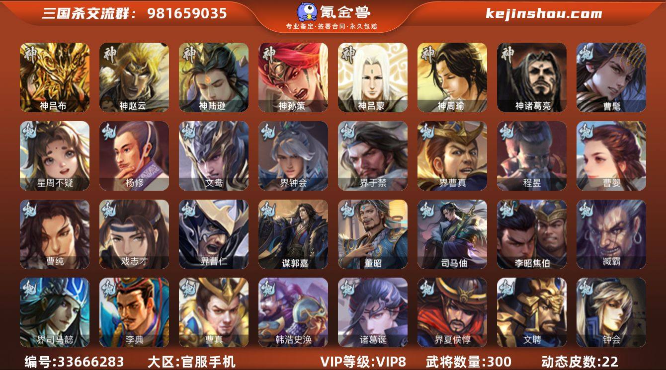 【JYSGS287】官阶:骠骑将军 VIP等级:VIP8级 史诗武将数:34 动态皮肤数:22 武将总数:300 史诗宝珠数:26 元宝数:56 将魂数:4781 /神诸葛亮/神吕布/神赵云/神陆逊/神孙策/界于禁/界钟会/界曹真/程昱/戏志才/杨修/曹婴/曹髦/曹纯/星周不疑/谋马超/谋赵云/谋关羽/花鬘/张星彩/董允/沙摩柯/文鸯/骆统/吴景/界朱然/许攸/谋张角/杜预/界左慈/沮授/界李儒/张让/兀突骨/星董卓/蒯越蒯良/谋徐晃/谋郭嘉/谋于禁/卞夫人/华歆/袁涣/崔琰/界曹操/界司马懿/界夏侯惇/界张辽/界许褚/界郭嘉/界曹仁/钟会/曹冲/郭淮/满宠/曹真/韩浩史涣/陈群/钟繇/界曹植/界王异/界满宠/界郭淮/界曹休/郭皇后/辛宪英/诸葛诞/曹昂/SP关羽/SP姜维/文聘/乐进/司马朗/SP蔡文姬/李典/吕虔/杜畿/鲁芝/毛玠/朱灵/牵招/李昭焦伯/司马孚/司马伷/董昭/臧霸/华雄/袁术/张绣/势田丰/谋刘赪/谋华雄/荀谌/羊祜/朱儁/界华佗/界吕布/界袁术/界貂蝉/界张角/界庞德/公孙瓒/伏皇后/李儒/蔡夫人/公孙渊/界公孙瓒/界刘表/界伏皇后/刘虞/蔡邕/伏完/张宝/SP赵云/刘协/张鲁/刘琦/董白/樊稠/SP太史慈/李傕/张梁/丁原/马元义/王濬/韩遂/阎象/贾充/张任/李傕郭汜/星徐晃/友庞统/神吕蒙/神周瑜/势陈到/谋张飞/陈震/费祎/糜夫人/刘巴/界刘备/界...