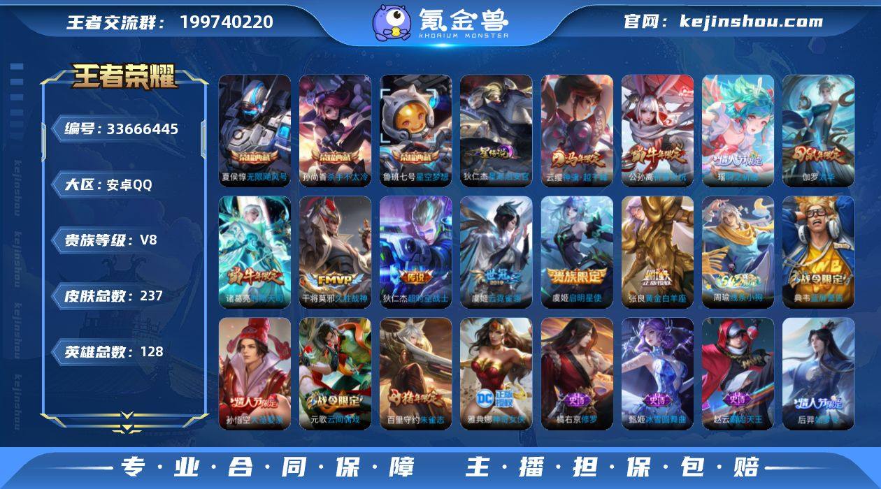捡漏小号 王者印记数量12+按键数量2+星传说数量1+铭文150级 安卓Q-V8-永恒钻石I段位-128英雄-237皮肤-3典藏皮肤-10传说-53史诗 【荣耀典藏】:夏侯惇无限飓风号,孙尚香杀手不太冷,鲁班七号星空梦想 【传说皮肤】:云缨神骥越千峰,瑶时之祈愿,公孙离祈雪灵祝,诸葛亮时雨天司,虞姬启明星使,伽罗太华,张良黄金白羊座,干将莫邪久胜战神,虞姬云霓雀翎,狄仁杰超时空战士 【限定皮肤】:白起狰,狄仁杰阴阳师,虞姬凯尔特女王,赵云皇家上将,嬴政白昼王子,鲁班七号狮舞东方,庄周蜃楼王,庄周玄嵩,高渐离玩趣恶龙,阿轲迷踪丽影,孙膑妖精王,芈月重明,吕布猎兽之王,元歌云间偶戏,夏侯惇朔风刀,甄姬游园惊梦,曹操烛龙,典韦穷奇,典韦蓝屏警告,狄仁杰魔术师,狄仁杰万华元夜,达摩星际陆战队,达摩沙漠行僧,项羽海滩派对,老夫子醍醐杖,程咬金演武夺筹,刘邦夺宝奇兵,兰陵王金庭之子,亚瑟潮玩骑士王,孙悟空大圣娶亲,牛魔御旌,后羿如梦令,李元芳银河之约,李元芳云中旅人,虞姬启明星使,钟馗神迹守卫,钟馗驱傩正仪,杨玉环遇见飞天,女娲朔望之晖,雅典娜单词大作战,雅典娜黎明之约,蔡文姬繁星吟游,东皇太一逐梦之光,鬼谷子原初探秘者,鬼谷子五谷...