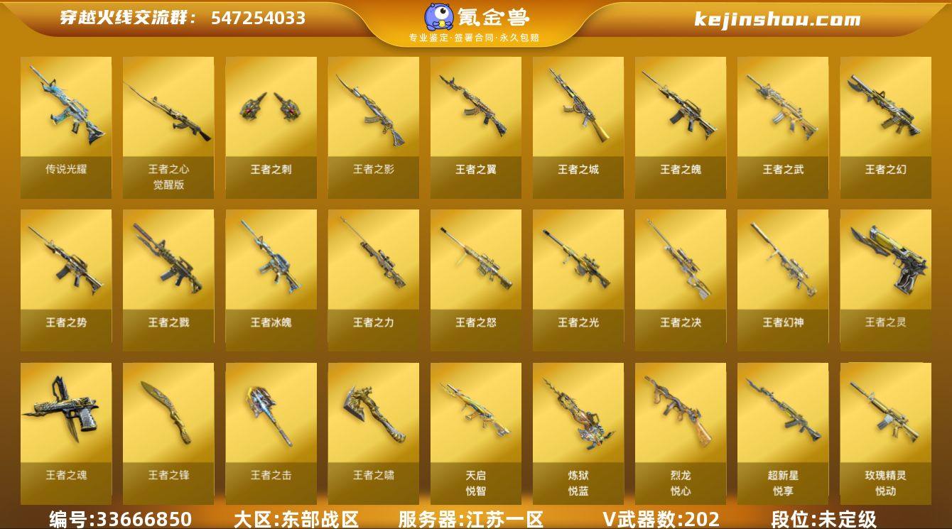 江苏一区-211V-50王者-8炫金 【传说武器】:传说光耀 【热门武器】:传说光耀,王者幻神,QBZ03-金色蔷薇,M4A1-青龙,M200-幻神,死亡之眼,金色小号,C.A.T,M4A1-黑骑士*7,汤姆逊-烈龙*7,RPK-盘龙*18,加特林-炼狱*7,火麒麟-绝迹,沙鹰-修罗*14,黄金猫猫手套,高爆手雷-幻兽*7 【王者炫金武器】:王者之城,王者冰魄,王者之戮*2,超新星-悦享,天启-悦智*7,王者之幻,王者之翼,王者之势,王者之武,玫瑰精灵-悦动*5,王者之影,王者之魄,王者幻神,王者之决,王者之光*2,王者之怒*2,王者之力,盘龙-悦心*2,炼狱-悦蓝*9,烈龙-悦心,王者之灵,王者之魂,王者之刺,王者之啸,王者之击,王者之锋,炫金火麒麟,炫金无影,炫金黑龙,炫金雷神*2,炫金武士,炫金天龙,炫金修罗 【音效卡】:M4A1-雷神音效卡,Barrett-毁灭音效卡,Barrett-碧霄极光音效卡 【皮肤】:雷神-暗月,雷神-能量核心*2,雷神-荣耀之魄,雷神-星空,火麒麟-雷神,火麒麟-华夏之心,火麒麟-平天大圣,毁灭-暗月*2,毁灭-黑大圣皮肤*2,毁灭-百城浙江 皮肤,黑龙-能量核心*2,黑骑士-暗月*2,无影-暗月*2,无影-能量核心*2,天启-暗月*5,战神-粉色甜心皮肤,战神-流金岁月皮肤,天龙-能量核...