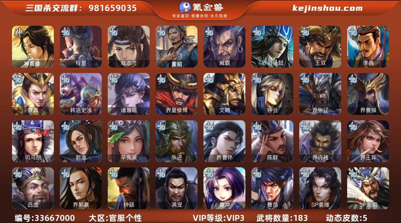 【JYSGS292】官阶:中军将军 VIP等级:VIP3级 史诗武将数:6 动态皮肤数:5 武将总数:183 史诗宝珠数:0 元宝数:2008 将魂数:952 /程昱/戏志才/界黄忠/马云騄/周群/刘焉/王双/界曹操/界司马懿/界夏侯惇/界张辽/界许褚/界郭嘉/钟会/曹冲/郭淮/满宠/曹真/韩浩史涣/陈群/钟繇/界王异/界曹休/辛宪英/诸葛诞/曹昂/SP关羽/SP姜维/文聘/乐进/司马朗/李典/吕虔/董昭/臧霸/华雄/袁术/势田丰/谋刘赪/谋卢植/界华佗/界吕布/界袁术/界貂蝉/界庞德/界袁绍/公孙瓒/伏皇后/李儒/蔡夫人/公孙渊/界刘表/刘虞/伏完/张宝/严白虎/刘琦/樊稠/SP太史慈/张济/王濬/乐就/神周瑜/严颜/谋张飞/谋黄月英/王甫赵累/向宠/界刘备/界关羽/界马超/界诸葛亮/界伊籍/关兴张苞/廖化/关平/刘封/吴懿/周仓/张松/界法正/界关兴张苞/界马岱/李严/马良/夏侯霸/SP徐庶/邓芝/张翼/诸葛果/彭羕/谋韩当/孙邵/张温/吕范/界甘宁/界黄盖/界周瑜/界大乔/界陆逊/程普/潘璋马忠/虞翻/朱然/孙鲁班/朱桓/孙休/界朱治/诸葛瑾/孙鲁育/卫温诸葛直/周鲂/阚泽/张布/凌操/费祎-安民护祚(动态)/大乔-珠玉琳琅/鲁肃-蛇年端午(动态)/刘焉-雄踞益州(动态)/刘焉-龙兴蜀川(动态)