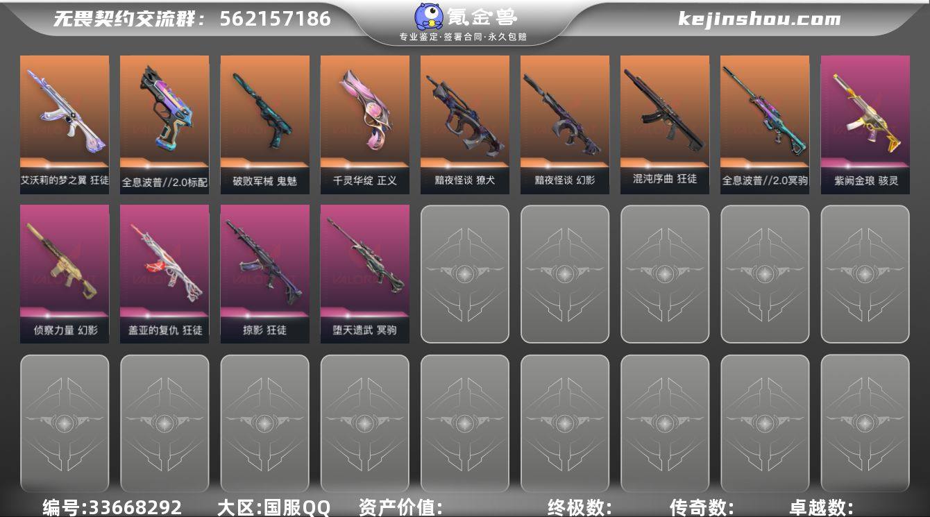 【wwxb863】LV等级135/皮肤总价值51780/段位白银/总皮肤数量97/刀皮数量8/枪皮数量89/套装数量3/具体详情请看图/黯夜怪谈套装/全息波普//2.0套装/VCTxEDG 队伍套装/幻棱/炼狱/维斯/暮蝶/钛狐/壹决/铁臂/捷风/雷兹/幽影/不死鸟/贤者/猎枭/蝰蛇/零/芮娜/奇乐/尚勃勒/霓虹/斯凯/夜露/星礈/K/O/海神/盖可/黑梦/钢锁/近战武器-奇点2.0蝴蝶刀/近战武器-黑波之刃/近战武器-鬼丸国纲/超能偶像应援棒/近战武器-超限闪存匕首/近战武器-全息战斧/近战武器-夜刃诡镰/星际猎兵-短剑/狂徒-归零者/狂徒-混沌序曲/狂徒-全息波普2.0/狂徒-塑水宗/狂徒-艾沃莉的梦之翼/狂徒-掠影/狂徒-盖亚的复仇/狂徒-超能偶像/狂徒-荒土机兵/幻影-2024全球冠军赛/幻影-黯夜怪谈/幻影-全息波普2.0/幻影-侦察力量/幻影-超限闪存/神圣领域 幻影/幻影-聚合之力/幻影-纳米打击/戍卫-超能偶像/戍卫-浮光跃金/戍卫-逆冲蛮牛/獠犬-黯夜怪谈/獠犬-采蜜小蜂队/獠犬-模拟赫兹/獠犬-逆冲蛮牛/冥驹-全息波普//2.0/冥驹-堕天遗武/冥驹-荒土机兵/冥驹-模拟赫兹/黯夜怪谈 飞将/飞将-聚合之力/莽侠-超限闪存/月球哨兵 莽侠/神圣领域 战神/战神-采蜜小蜂队/战神-浮光跃金/奥丁-纳米打击/判官-超能偶像/判官-采蜜小蜂队/判官-纳米...