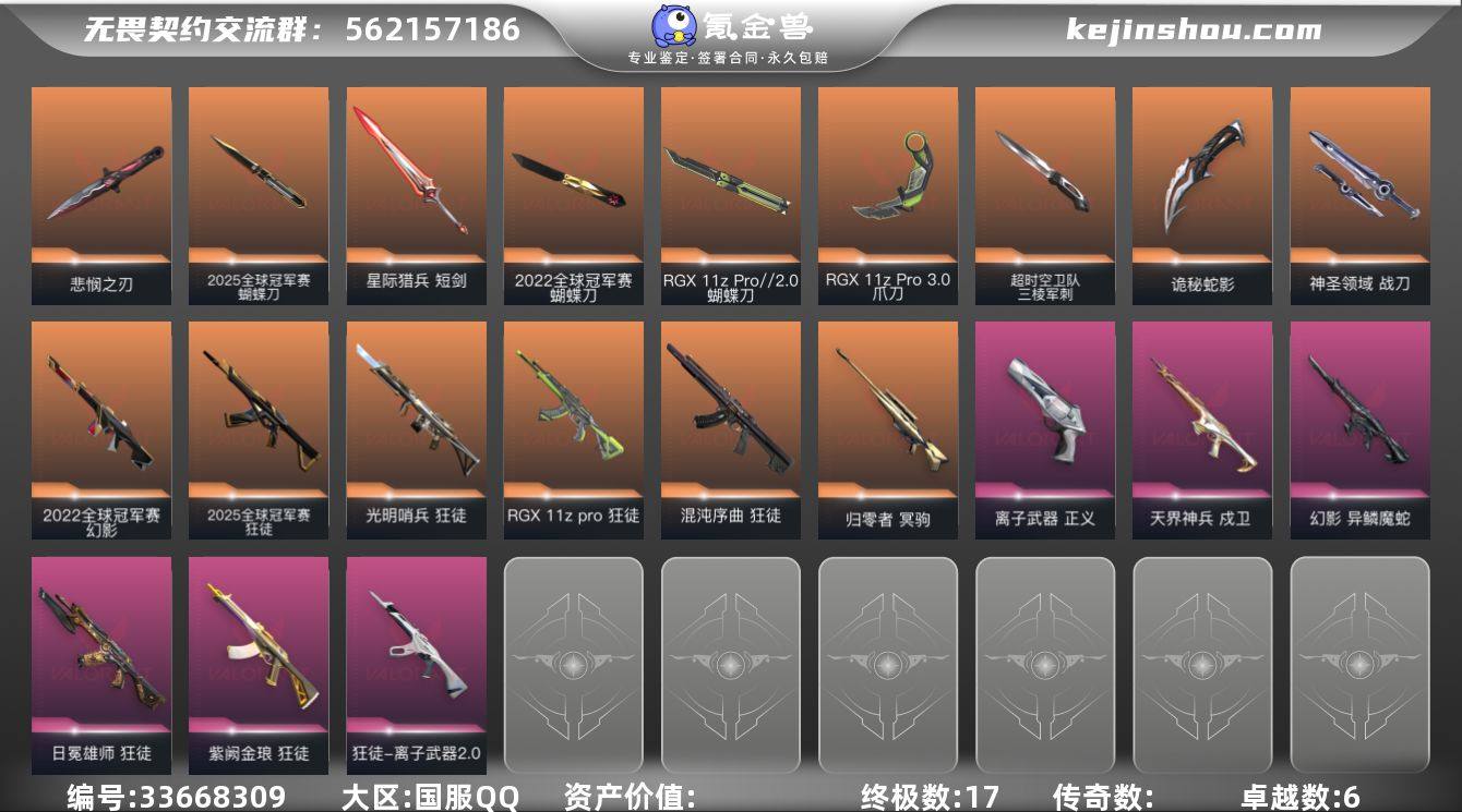 【959432】【wwxb851】LV等级256/皮肤总价值45720/段位铂金/总皮肤数量68/刀皮数量12/枪皮数量56/套装数量3/具体详情请看图/2025全球冠军赛套装/2022全球冠军赛套装/无畏契约季前邀请赛套装/幻棱/炼狱/暮蝶/钛狐/壹决/铁臂/捷风/不死鸟/贤者/猎枭/蝰蛇/芮娜/尚勃勒/霓虹/星礈/近战武器-2025全球冠军赛 蝴蝶刀/近战武器-2022全球冠军赛 蝴蝶刀/近战武器-无畏契约季前邀请赛 悲悯之刃/近战武器-魔术火花/近战武器-超时空卫队 三棱军刺/近战武器-RGX 11z Pro//2.0 蝴蝶刀/近战武器-RGX 11z Pro//3.0 爪刀/近战武器-定海神珍/近战武器-诡秘蛇影 军刀/近战武器-神圣领域 战刀/近战武器-星际猎兵 短剑/狂徒-2025全球冠军赛/狂徒-光明哨兵/狂徒-混沌序曲/狂徒-RGX 11z Pro/狂徒-日冕雄师/狂徒-紫阙金琅/狂徒-离子武器//2.0/狂徒-诡秘蛇影/幻影-2022全球冠军赛/幻影-异鳞魔蛇/幻影-神圣领域/幻影-末日之翼/戍卫-天界神兵/戍卫-月球哨兵/戍卫-折光棱晶/獠犬-神圣领域/冥驹-归零者/冥驹-星云暗涌/飞将-末日之翼/莽侠-诡秘蛇影/莽侠-月球哨兵/战神-神圣领域/奥丁-末日之翼/判官-诡秘蛇影/雄鹿-月球哨兵/骇灵-无限竞技/骇灵-星云暗涌/蜂刺-星云暗涌/蜂刺-折光棱晶/标配-折光棱晶/正义-离子...