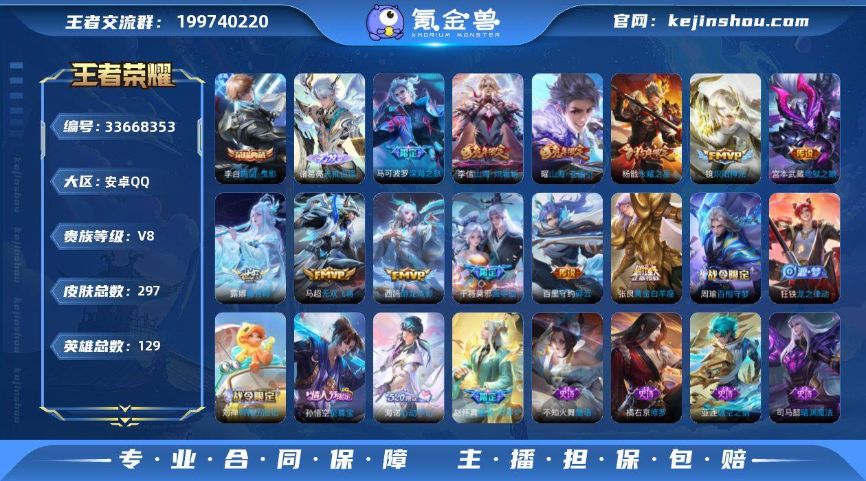 V8 1典藏 1无双 20传说 129英雄 297皮肤 可二次 可修改实名 男号 【英雄全皮】元歌全皮,敖隐全皮,空空儿全皮,孙权全皮,蚩奼全皮,海诺全皮,刘禅全皮,戈娅全皮,影全皮,大禹全皮 【稀有英雄】敖隐(小龙人),大司命,嬴政(始皇帝),韩信(韩跳跳),夏洛特(夏师傅),艾琳,橘右京(橘子),娜可露露(鸟人),不知火舞,赵云,金蝉(唐僧),戈娅 【荣耀水晶】鸣剑·曳影 【无双皮】天机白泽 【传说皮】神骥·越千峰,诡秘之主,神树通天,游龙清影(小青龙),山海·炽霜斩(李信年限),黄金白羊座,地狱之眼,炽阳神光,无双飞将,时之恋人-刘备(电焊工),碎云,山海·苍雷引(电光曜子),画中仙,霜月吟,澜逐花归海 【珍宝阁皮】妄想食味,女武神,玩趣恶龙 【赛季/战令皮】噬灭天穹(s37),古海寻踪(s33),星界游侠,海盐诗旅(s30),擒涛扼浪(s31),潮玩骑兵,奇幻香踪,探海日志(s32),驭风魔法,玲珑珍味,流音漫舞,地狱燃心,剑破天穹(s35),天穹祈灯(s34),青焰无极,苍威无极,天穹之誓(s36),蔡文姬夏日便利店,虞姬夏日便利店,暖冬·兔眠,御霄(s14),御旌(s15),御銮(s16),朔风刀(s17),混沌棋(s18),疑决卦(s19),醍醐杖(s20),原初探秘者(s21),万华元夜(s22),演武夺筹(s23),驱傩正仪(s24),千军破阵(s25),朔望之晖,蓝屏警告,赤莲之焰,银河...