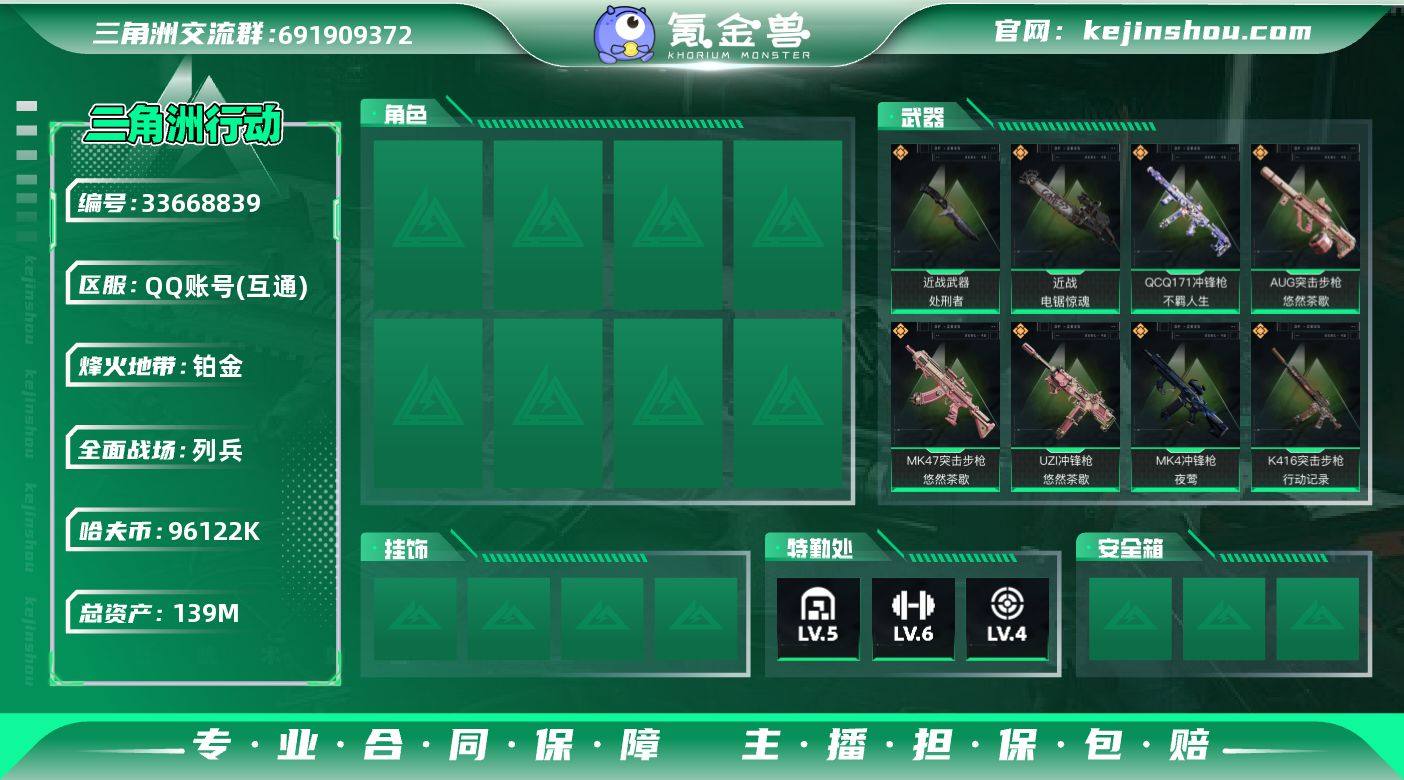 【PTSJZ4830】总资产139M/哈夫币9612万/传说近战数1/传说枪皮数10/战场等级9/行动等级60/安全箱等时效性道具以游戏内数据为准,详情请看图/近战-处刑者/近战-黑鹰/近战-电锯惊魂/K416突击步枪-行动记录/AUG突击步枪-悠然茶歇/MK47突击步枪-悠然茶歇/UZI冲锋枪-悠然茶歇/QCQ171冲锋枪-不羁人生/MK4冲锋枪-夜莺/M14射手步枪-蛮荒/M14射手步枪-缄花/SR-25射手步枪-缄花/.357左轮-缄花/K416突击步枪-腊梅/K416突击步枪-阿萨拉特攻/腾龙突击步枪-猎鳄行动/K437突击步枪-丛林谍踪/MP5冲锋枪-深海恐惧/SMG45冲锋枪-阿萨拉特攻/SR-3M紧凑突击步枪-开工大吉/勇士冲锋枪-丛林谍踪/MP7冲锋枪-六套之力/PKM通用机枪-阿萨拉特攻/M249轻机枪-丛林谍踪/M250通用机枪-囚徒/QJB201轻机枪-炽焰/VSS射手步枪-丛林谍踪/SV-98狙击步枪-囚徒/PSG-1射手步枪-休闲时光/SG552突击步枪-马年新春/SG552突击步枪-贴花艺术/ AK-12突击步枪-马年新春/CAR-15突击步枪-来财/KC17突击步枪-来财/MP5冲锋枪-哈夫克卫队/SMG-45冲锋枪-行动开启/SR-3M紧凑突击步枪-马年新春/M1014霰弹枪-幻影结构/QJB201轻机枪-哈夫克卫队/Mini-14射手步枪-来财/SR-25射手步枪-开拓/SV-98狙击步枪-星链科技/SV-98狙击步枪-哈夫克航天...