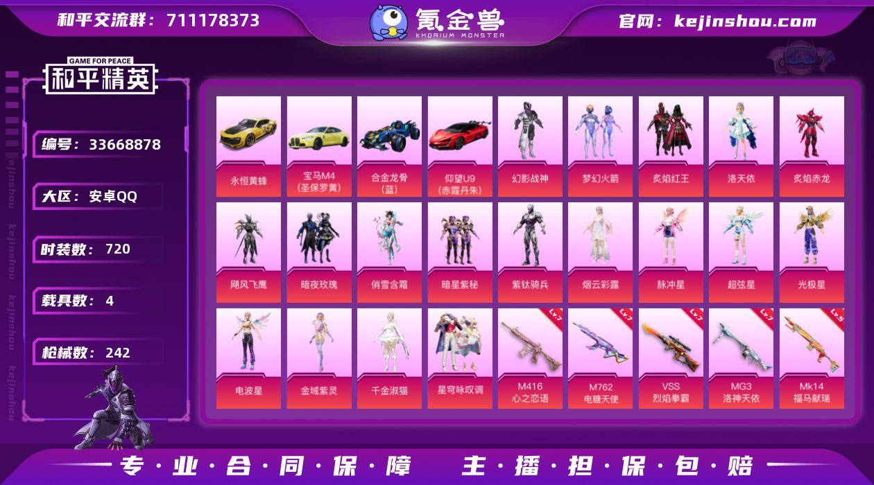 实名: 可修改 时装数: 720 载具数: 4 枪械数: 242 战备数: 4 热门装扮: 梦幻火箭(新101),幻影战神,鹰眼刺客,炙焰红王,炙焰赤龙,飓风飞鹰,暗夜玫瑰,俏雪含霜,洛天依,暗星紫秘,紫钛骑兵,烟云彩露,脉冲星,超弦星,光极星,电波星,金域紫灵,千金淑猫,星穹咏叹调 载具: 合金龙骨(蓝),永恒黄蜂,仰望U9(赤霞丹朱),宝马M4(圣保罗黄) 稀有枪皮: MG3洛神天依,M416心之恋语,VSS烈焰拳霸,P90-电糖天使,M762-电糖天使,Kar98K-巳巳如意,DP-28-豹影疾电,MK14-福马献瑞 亮点: 【优质装备】:Mark.06(新蓝螳螂),七级M762-电糖天使,七级MG3-洛神天依,七级VSS-烈焰拳霸,七级M416-心之恋语