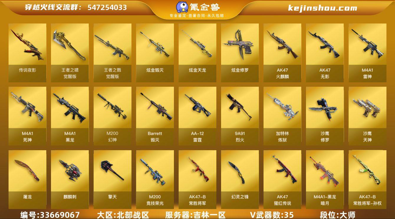 吉林一区-40V-2王者武器数-4炫金武器数 【传说武器】:传说夜影 【热门武器】:传说夜影,M4A1-青龙,M200-幻神,M200-竞技荣光,加特林-炼狱,沙鹰-修罗,金刚伞 【王者炫金武器】:炫金毁灭,炫金天龙,炫金修罗*2 【音效卡】:AK47-火麒麟音效卡 【皮肤】:黑龙-暗月,战神-粉色甜心皮肤*2,战神-流金岁月皮肤,AK47-B-常胜将军-曹操*2,AK47-B-常胜将军-刘备,AK47-B-常胜将军-孙权*2 【角色】:葵,魅影,关小雨,王者-瞳-闭月羞花,王者-葵-貂蝉,王者涂鸦,嘉年华灵狐,娟娟,灵动武士,零-水下丽影 【人偶武器】:天龙-曼陀罗,AWM-灵狐-15周年嘉年华,闪光弹-小乔,闪光弹-貂蝉,高爆手雷-大乔 【英雄级武器】:AK47-火麒麟,M4A1-黑龙,M4A1-雷神,AK47-无影,M4A1-死神,M4A1-青龙,9A91-烈火,王者之戮-觉醒版,AK-47-猩红传说*2,AK47-B-常胜将军,Barrett-毁灭,M200-幻神,M200-竞技荣光,加特林-炼狱,AA-12-雷霆,沙鹰-修罗,沙鹰-天神,屠龙,擎天,麒麟刺,幻灵之锋,王者之啸-觉醒版,高爆手雷-幻灵*2,高爆手雷-竞技荣光,闪光弹-幻灵,闪光弹-竞技荣光,烟雾弹-幻灵,烟雾弹-竞技荣光 【道具】:炫彩背包,背包-葫芦兄弟,超级背包,夺命之镰,防化服,...