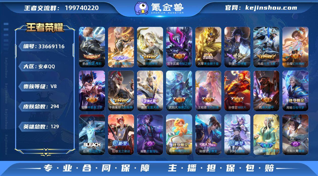 1珍品传说 31传说 129英雄 294皮肤 可二次 可修改实名 男号 【英雄全皮】司空震全皮,敖隐全皮,空空儿全皮,孙权全皮,蚩奼全皮,鬼谷子全皮,影全皮,大禹全皮 【稀有英雄】敖隐(小龙人),大司命,嬴政(始皇帝),韩信(韩跳跳),夏洛特(夏师傅),艾琳,橘右京(橘子),娜可露露(鸟人),不知火舞,赵云,金蝉(唐僧),戈娅 【荣耀水晶】鸣剑·曳影 【无双皮】无相,器灵·螭龙剑 【珍品传说】酷洛米之心 【传说皮】异界灵契-花木兰,神骥·聚万邦,神骥·镇沧海,神骥·逐星野,神骥·越千峰,神骥·鸣幻洲,神骥·赴朔漠,玄雷天君,幻光神枪,神树通天,黄金狮子座,地狱火,仲夏夜之梦(大飞蛾),海洋之心,地狱之眼,末日机甲-孙尚香(绿蚂蚱),一念神魔,久胜战神,炽阳神光,无双飞将,音你心动-周瑜,乞巧织情,绛天战甲(鸡嘴战神) 【珍宝阁皮】万物之道,优雅恋人,玩趣恶龙 【赛季/战令皮】古海寻踪(s33),海盐诗旅(s30),擒涛扼浪(s31),潮玩骑兵,探海日志(s32),驭风魔法,玲珑珍味,流音漫舞,顽趣-梦奇,地狱燃心,剑破天穹(s35),天穹祈灯(s34),醍醐杖(s20),原初探秘者(s21),万华元夜(s22),演武夺筹(s23),驱傩正仪(s24),千军破阵(s25),云间偶戏,圣弓游侠,真爱魔法,沙漠行僧(s26),金庭之子(s27),大漠名商(s28),云中旅人(s29) 【史...