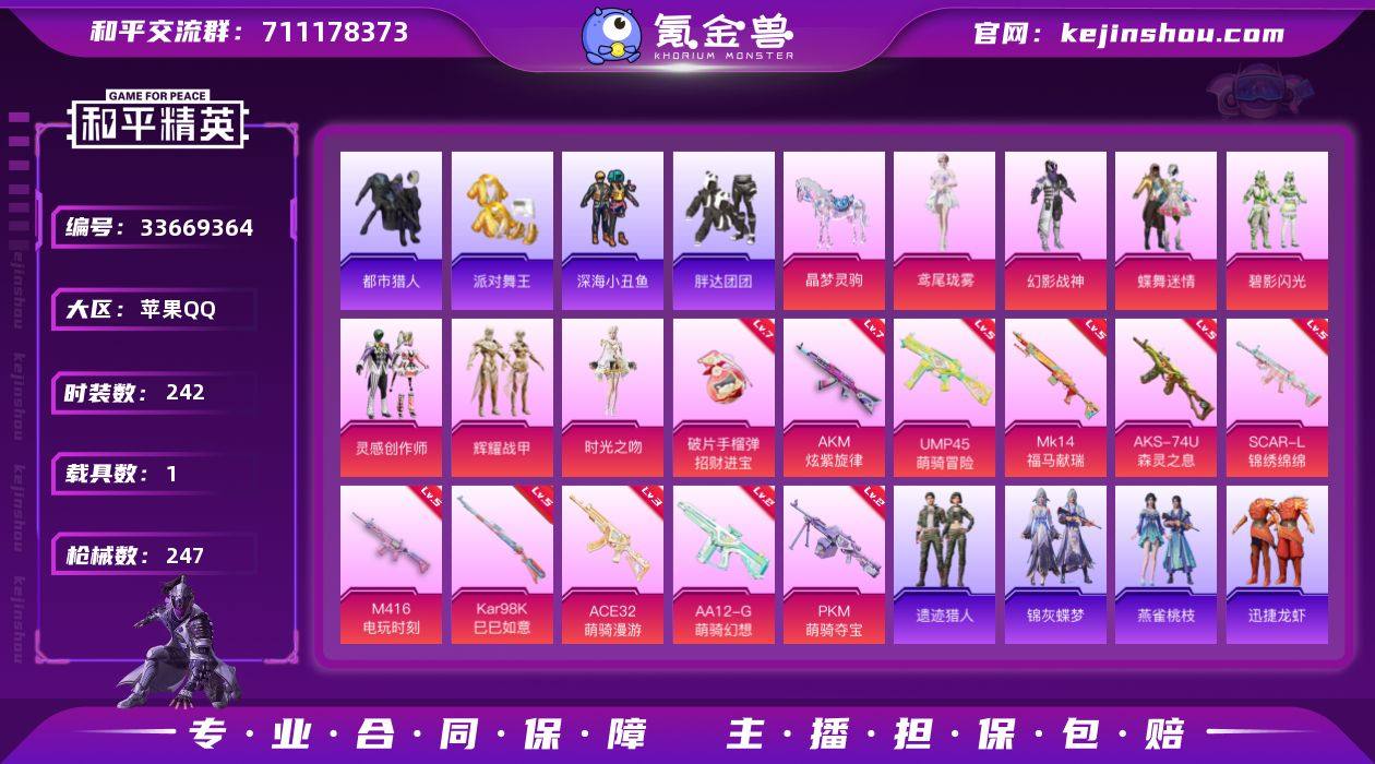 苹果 手Q-7粉装-11特效枪-1载具-6粉色飞行器-82672热力值-16王牌印记-242套装-247枪皮 【热门品类】:套装-浪漫天命,套装-都市猎人,套装-派对舞王,套装-深海小丑鱼,角色-军刀雅典娜,套装-胖达团团,套装-金羽特工,套装-SS1特训,套装-暗影哥特,套装-浪漫波比,熔岩游骑兵连帽夹克 【粉色套装】:粉装-幻影战神,粉装-蝶舞迷情,粉装-碧影闪光,粉装-灵感创作师,粉装-辉耀战甲,角色-时光之吻,角色-鸢尾珑雾 【粉色枪皮等级】:AKM-炫紫旋律(七级),SCAR-L-锦绣绵绵(五级),M416-电玩时刻(五级),ACE32-萌骑漫游(三级),UMP45-萌骑冒险(五级),AKS-74U-森灵之息(五级),Kar98K-巳巳如意(五级),Mk14-福马献瑞(五级),AA12-G-萌骑幻想(二级),PKM-萌骑夺宝(二级),破片手榴弹-招财进宝(七级) 【粉色载具】:晶梦灵驹 【粉色枪皮】:AKM-炫紫旋律,SCAR-L-锦绣绵绵,M416-电玩时刻,ACE32-萌骑漫游,UMP45-萌骑冒险,AKS-74U-森灵之息,Kar98K-巳巳如意,Mk14-福马献瑞,AA12-G-萌骑幻想,PKM-萌骑夺宝,破片手榴弹-招财进宝 【粉色飞行器】:深海曼妙飞行器,炫彩糖果飞行器,星之彼岸飞行器,时光之吻飞行器,时光之誓飞行器,纱华羽翼飞行器 【粉色降落伞】:快乐主...