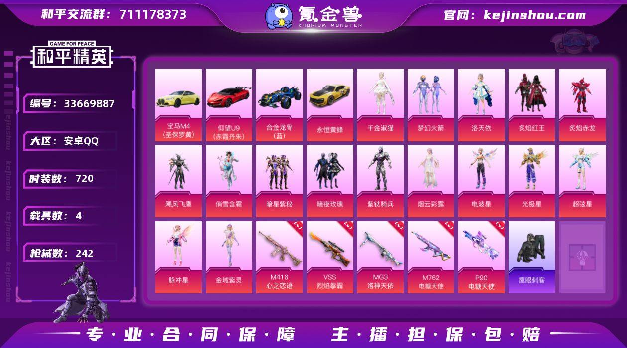18粉装 8特效枪 4载具 14印记 可二次 可修改实名 【热门装扮】星穹咏叹调,千金淑猫,梦幻火箭(新101) ,洛天依,幻影战神,炙焰红王,炙焰赤龙,飓风飞鹰,俏雪含霜,暗星紫秘,暗夜玫瑰,紫钛骑兵,烟云彩露,电波星,光极星,超弦星,脉冲星,金域紫灵,鹰眼刺客 【载具】宝马M4(圣保罗黄),仰望U9(赤霞丹朱),合金龙骨(蓝),永恒黄蜂 【稀有枪皮】Kar98K-巳巳如意,14-福马献瑞,DP-28-豹影疾电,M416心之恋语,VSS烈焰拳霸,MG3洛神天依,M762-电糖天使,P90-电糖天使 【七级特效枪】七级M762-电糖天使,七级VSS-烈焰拳霸,七级M416-心之恋语,七级MG3-洛神天依 【五级特效枪】五级Kar98K-巳巳如意,五级DP-28-豹影疾电,五级14-福马献瑞 【三级特效枪】三级P90-电糖天使 【紫色装扮】马上有钱,凌霄紫焰,朱霞炽焰,SS34特训套装,游乐,极速红龙,沙漠兵团,格斗先锋,探宝勇士,夏日音浪,凛冬战士,刚毅裁决者,北国孤狼,千禧之恋,坚韧舞者,夜莺强袭者,幻世战舞者,幻影武者,怒火燎原,战地督导,战地菁英,甜蜜熊情侣,甜蜜菠萝,疯狂小兔子,破晓战魂,福星高照,空岛之星,空投萌叽,竞技勇士朋克,红色运动,绮丽涂鸦,潮流炫酷,炫蓝之夏,热血青春,特战装甲,特殊使命,特训学院,冷焰舞者,SS21特训,绚烂繁星,田园牧歌,飞驰魅...