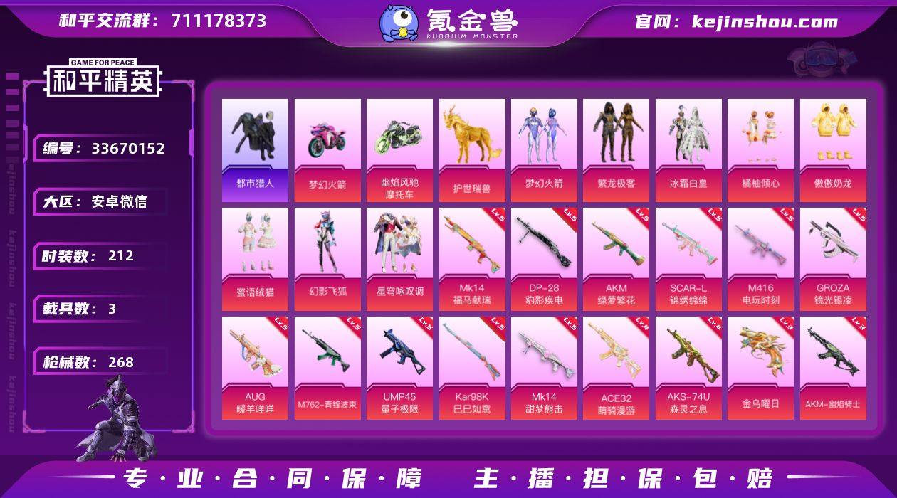 【LHPD766】【店主推荐捡漏号!可直接换绑】安卓 微信-9粉装-16特效枪-3载具-6粉色飞行器-89087热力值-16王牌印记-212套装-268枪皮【热门品类】:粉装-梦幻火箭,粉装-繁龙极客,套装-浪漫天命,套装-都市猎人,套装-龟仙人,套装-暗影哥特,套装-粉红小猪,熔岩游骑兵连帽夹克【粉色套装】:粉装-梦幻火箭,粉装-冰霜白皇,粉装-橘柚倾心,粉装-傲傲奶龙,粉装-繁龙极客,粉装-蜜语绒猫,粉装-幻影飞狐,粉装-星穹咏叹调【粉色枪皮等级】:AKM-绿萝繁花(五级),AKM-幽焰骑士(三级),SCAR-L-锦绣绵绵(五级),SCAR-L-金蛇镇世(三级),M416-电玩时刻(五级),GROZA-镜光银凌(五级),AUG-暖羊咩咩(五级),M762-青锋波束(五级),ACE32-萌骑漫游(四级),UMP45-量子极限(五级),AKS-74U-森灵之息(四级),Kar98K-巳巳如意(五级),Mk14-甜梦熊击(五级),Mk14-福马献瑞(五级),DP-28-豹影疾电(五级),信号枪-金乌曜日(三级)【粉色载具】:双人摩托-梦幻火箭,幽焰风驰摩托车,护世瑞兽【粉色枪皮】:AKM-绿萝繁花,AKM-幽焰骑士,SCAR-L-锦绣绵绵,SCAR-L-金蛇镇世,M416-电玩时刻,GROZA-镜光银凌,AUG-暖羊咩咩,M762-青锋波束,ACE32-萌骑漫游,UMP45-量子极限,AKS-74U-森灵之息,Ka...