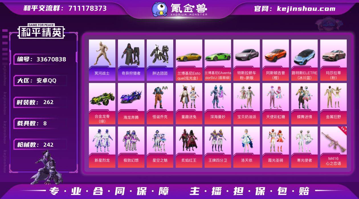 安卓 【素材号 无敌战神框/粉装-怪诞乔克/木乃伊/套装-暗影哥特/角色-洛天依/M416-心之恋语(七级)/AUG-星之彼岸(四级)/兰博基尼Aventador SVJ(翡翠绿)/百万伏特背包】手Q-无敌战神框-15粉装-7特效枪-8载具-4粉色飞行器-98237热力值-13王牌印记-262套装-242枪皮 【热门品类】:粉装-怪诞乔克,粉装-童趣迷兔,套装-浪漫天命,套装-冥河战士,套装-小丑鱼,套装-奇异狩猎者,套装-胖达团团,套装-金羽特工,套装-SS1特训,套装-龟仙人,套装-潮萌小黄鸭,套装-暗影哥特,套装-粉红小猪,熔岩游骑兵连帽夹克 【粉色套装】:粉装-深海曼妙,粉装-怪诞乔克,粉装-宝贝奶油派,粉装-天使彩虹糖,粉装-蝶舞迷情,粉装-金属狂野,粉装-新星烈龙,粉装-极致幻想,粉装-星空之魅,粉装-童趣迷兔,粉装-炙焰红王,粉装-王牌四分卫,角色-洛天依,粉装-霞光圣骑,粉装-寒光使者 【粉色枪皮等级】:M416-心之恋语(七级),AUG-星之彼岸(四级),M762-激战未来(六级),Kar98K-巳巳如意(五级),SKS-碧影闪光(三级),Mk14-福马献瑞(一级),DP-28-豹影疾电(四级) 【粉色载具】:特斯拉Roadster(沁心粉),兰博基尼Aventador SVJ(翡翠绿),兰博基尼Estoque(炫光金),阿斯顿马丁DBX(橙),...
