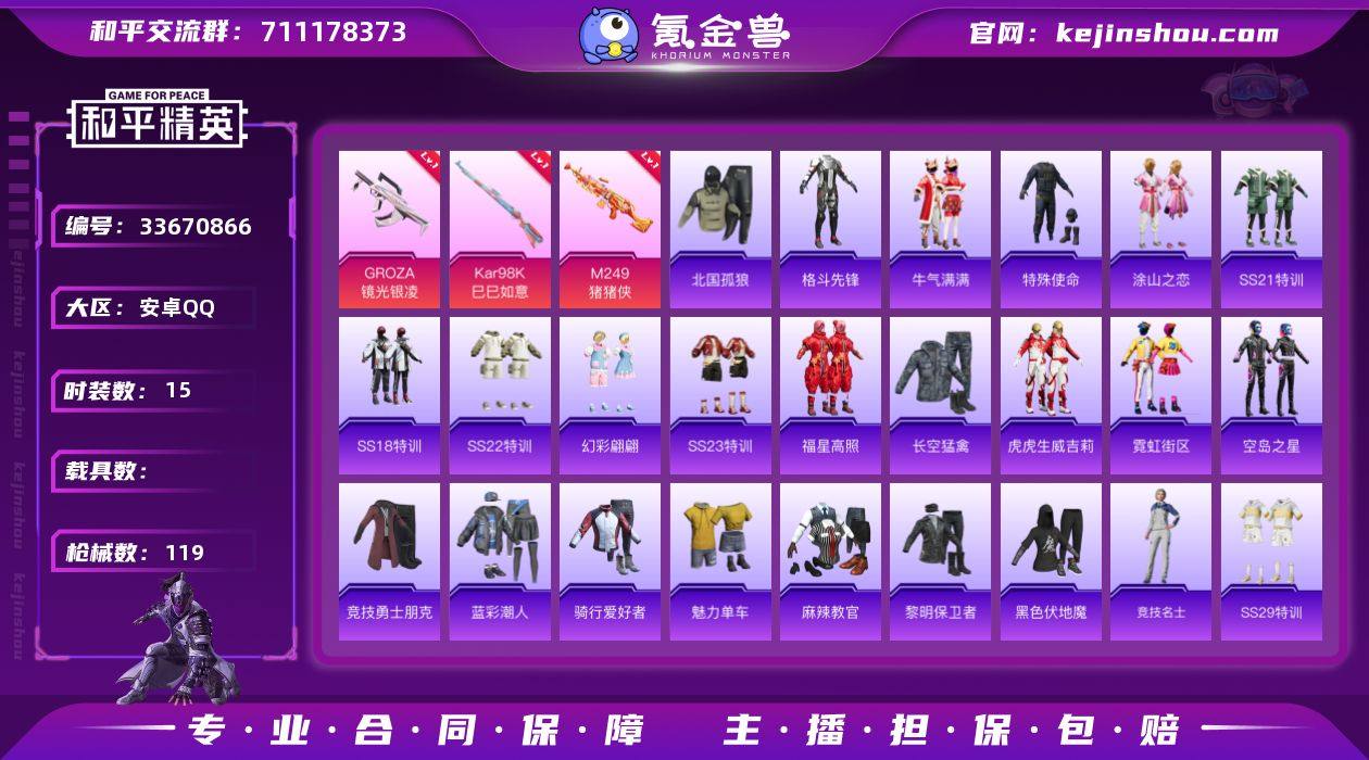 级59-五级M249-猪猪侠-3特效枪-素材号】安卓 手Q-0粉装-3特效枪-0载具-0粉色飞行器-29214热力值-1王牌印记-55套装-119枪皮 【粉色枪皮等级】:GROZA-镜光银凌(五级),Kar98K-巳巳如意(四级),M249-猪猪侠(五级) 【粉色枪皮】:GROZA-镜光银凌,Kar98K-巳巳如意,M249-猪猪侠 【粉色降落伞】:深海曼妙降落伞,繁花小夜曲降落伞,洛神天依降落伞,旋转彩虹降落伞,暗夜鎏金降落伞,精灵梦叶罗丽降落伞 【稀有套装】:套装-燕燕于飞,套装-鱼渊荷华安卓Q区-3特效枪-29214热力值-55套装-119枪皮【特效枪等级】:GROZA-镜光银凌(五级- GROZA-镜光银凌)Kar98K-巳巳如意(四级- Kar98K-巳巳如意)M249-猪猪侠(五级- M249-猪猪侠)【优质武器皮肤】: GROZA-镜光银凌 Kar98K-巳巳如意 M249-猪猪侠【稀有武器皮肤】: DBS-乌木金纹 Vector-创世·救赎 SCAR-L-海盐豹豹 GROZA-镜光银凌 Kar98K-巳巳如意 20-H-乌木金纹 M249-猪猪侠 蜜獾-乌木金纹 PKM-啾咪啾咪 M416-红色方程式 M416-蓝色火焰 M416-夜灯 M416-糯团青竹 AKM-破晓战魂 AKM-虎虎生威 AKM-萌趣颜团子 SCAR-L-红色方程式 SCAR-L-玉兔迎春 SCAR-L-炫彩节奏 M16A4-红色方程式 GROZA-乌木金纹 AUG-耀粉歌者 QBZ-乌木金纹 QBZ-彩虹符...