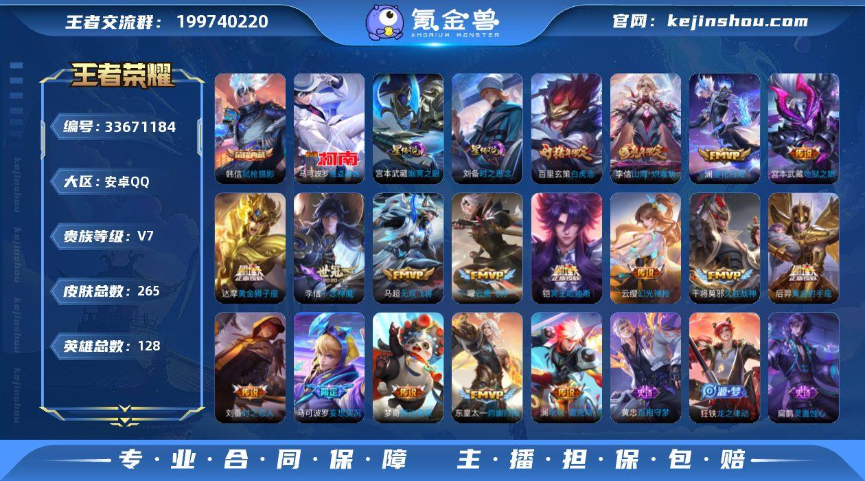 ·怪盗基德·弑枪猎影·冥王哈迪斯·愿照山河定·黛西宝·山海炽霜斩·白虎志·妄想实况·逐花归海·无双飞将·云鹰飞将·电玩雷克斯·谪仙醉月·至尊宝·无二次包过】w25502-安卓Q-128英雄-265皮肤-13王者印记-300铭文-贵族积分4w【贵族7】【1典藏·1无双·1珍品·2星传说·20传说·13按键】【因赛季更新游戏段付以上号为准!】 【英雄全皮】:孙权全皮,鬼谷子全皮,李信全皮,敖隐全皮,蒙恬全皮,司空震全皮,空空儿全皮,影全皮 【荣耀典藏】:韩信弑枪猎影 【无双皮肤】:李信问心剑 【珍品传说】:马可波罗怪盗基德 【星元皮肤】:宫本武藏幽冥之眼,刘备时之思念 【传说皮肤】:后羿神树通天,司空震愿照山河定,云缨幻光神枪,桑启鸣野蒿,铠冥王哈迪斯,澜逐花归海,马可波罗妄想实况,东皇太一灼幽烈阳,澜电玩雷克斯,李信山海炽霜斩,马超无双飞将,曜云鹰飞将,李信一念神魔,刘备时之恋人,干将莫邪久胜战神,达摩黄金狮子座,百里玄策白虎志,梦奇胖达荣荣,后羿黄金射手座,宫本武藏地狱之眼 【限定皮肤】:铠冥王哈迪斯,暃埋骨钱,姜子牙天穹之誓,李白谪仙醉月,狄仁杰阴阳师,赵云皇家上将,元歌无心,马可波罗妄想实况,狄仁杰魔术师,狄仁杰万华元夜,项羽海滩派对,老夫子...