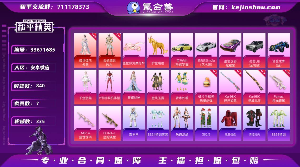 "DB5526-安V-可改实名可转区-27印记-6绝世-2红装-5粉装-6特效枪-7载具(送506大转盘碎片) 5级云鸾-1级烛九-千金梳猫-香水柠檬-明日香-老6服 死噶金蛇镇世3级-98K圣域龙灵3级-MK14盛世惊鸿2级-满级手榴弹热量炸弹 盛世惊鸿摩托车-黄宝马M4-绿仰望U8-银帕加尼-蓝合金龙骨-麒麟马" 安卓微信-27王牌印记-2红装-5粉装-6特效枪-7载具-热力值-230套装-335枪皮-10卓越印记-10传奇印记 【2红装】金蛇镇世-烛九/1级,盛世惊鸿-云鸾/5级 【5粉装】套装-金风玉露,角色-智耀战神,角色-千金淑猫,套装-香水柠檬,角色-2号机款机体服 【6特效枪】Kar98K-圣域龙灵/3级,Mk14-盛世惊鸿/2级,Kar98K-巳巳如意/5级,SCAR-L-金蛇镇世/3级,Famas-翎光蝶翼/2级,破片手榴弹-热量炸弹/7级 【3稀有紫装】雪山精英,明日香款战斗服,龟仙人 【7稀有载具】宝马M4(圣保罗黄),仰望U8(龙石绿),帕加尼imola(艺术银),虚妄之影(炫耀紫),合金龙骨(蓝),护世瑞兽,盛世惊鸿摩托车 【230稀有时装】烛九/1级,云鸾/5级,2号机款机体服,千金淑猫,智耀战神,金风玉露,香水柠檬,龟仙人,雪山精英,明日香款战斗服,爱崽白熊,神秘黑猫,狂徒小丑,石蕴玉辉,龙魂突击队,小熊娃娃,鲛海歌灵,异域银装,神气赞萌露比,街头风暴,星途旅人,蜜桃...
