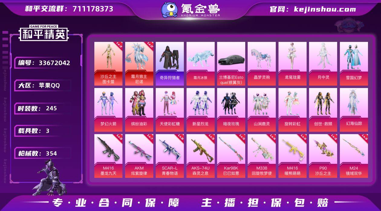 【LHPD835】带1258点券【特价出售/店主推荐】苹果 手Q-2神装-12粉装-11特效枪-3载具-6粉色飞行器-118863热力值-26王牌印记-245套装-354枪皮 【红色神装等级】:霜月狼主-尼诺(二级),沙丘之主-图卡盟(三级) 【红色角色神装】:霜月狼主-尼诺,沙丘之主-图卡盟 【热门品类】:粉装-雪国幻梦,粉装-梦幻火箭,粉装-缤纷油彩,套装-奇异狩猎者,套装-金羽特工,套装-暗夜行者,套装-SS1特训,套装-龟仙人,套装-暗影哥特,套装-粉红小猪,角色-Mark.06,熔岩游骑兵连帽夹克 【粉色套装】:粉装-天使彩虹糖,粉装-雪国幻梦,粉装-梦幻火箭,粉装-缤纷油彩,粉装-新星烈龙,粉装-暗夜玫瑰,粉装-山涧鹿灵,粉装-旋转彩虹,套装-创世·救赎,角色-幻海仙踪,角色-月中灵,角色-鸢尾珑雾 【粉色枪皮等级】:UMP45-霜月狼主(二级),AKM-炫紫旋律(七级),SCAR-L-青春物语(六级),M416-暖熊萌萌(四级),M416-墨龙九天(九级),AKS-74U-森灵之息(五级),P90-沙丘之主(三级),Kar98K-巳巳如意(五级),M24-镜域双华(三级),M338-回旋牧梦使(四级) 【粉色载具】:兰博基尼Estoque(银翼灰),晶梦灵驹,霜月冰狼 【粉色枪皮】:AKM-炫紫旋律,SCAR-L-青春物语,M416-暖熊萌萌,M416-墨龙九天,...