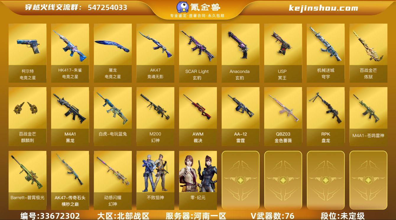 实名: 可修改 排位资格: 有 V武器: M4A1-黑龙,AWM-裁决,M200-幻神,AA-12-雷霆,QBZ03-金色蔷薇,RPK-盘龙,白虎-电玩蓝兔,Barrett-碧霄极光,M4A1-苍鸣雷神,麒麟刺-百战金芒,炼狱-百战金芒,机械迷城-穹宇,SCAR Light-玄豹,Anaconda-玄豹,USP-冥王,异变清道夫-蛇影双骄,HK417-朱雀-电竞之星,屠龙-电竞之星,AK47-竞魂无影,柯尔特-电竞之星 狙击枪稀有皮肤: 幻神-动感闪耀 皮肤 英雄角色: 零·纪元,不败狙神,幻面灵狐,葵-阿尔法武装 音效道具: 屠龙-电竞之星-竞星跃动音效卡,HK417-朱雀-电竞之星-竞星跃动音效卡 亮点: 玄豹套【热门武器】:QBZ03-金色蔷薇,M200-幻神,白虎-电玩蓝兔,RPK-盘龙 【王者炫金武器】:王者玄武