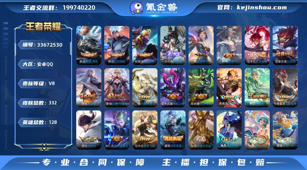 安卓QQ区王者荣耀账号,V8等级,128位英雄全英雄,332款皮肤,3荣耀典藏皮肤,16款传说皮肤,无防沉迷限制,支持修改实名,安全换绑,放心购买。 在售传说皮肤:冠军飞将、启明星使、超时空战士、黄金白羊座等16款传说皮肤,多款优质史诗皮肤:鸭鸭历险记、天秀·启明、心灵战警、功夫厨神、遇见飞天、破空之剑、荣光圣徽、五谷丰年、无心、星界战将、暗夜贵公子、猫狗日记、江河有灵、曙光守护者、天才门将,多款限定史诗,皮肤数量多,图鉴齐全,账号资源丰富。 账号无违规,无封禁记录,可正常换绑,诚心出售,可小刀,屠龙刀勿扰,看中直接下单,客服全程验号担保交易,安全无忧。