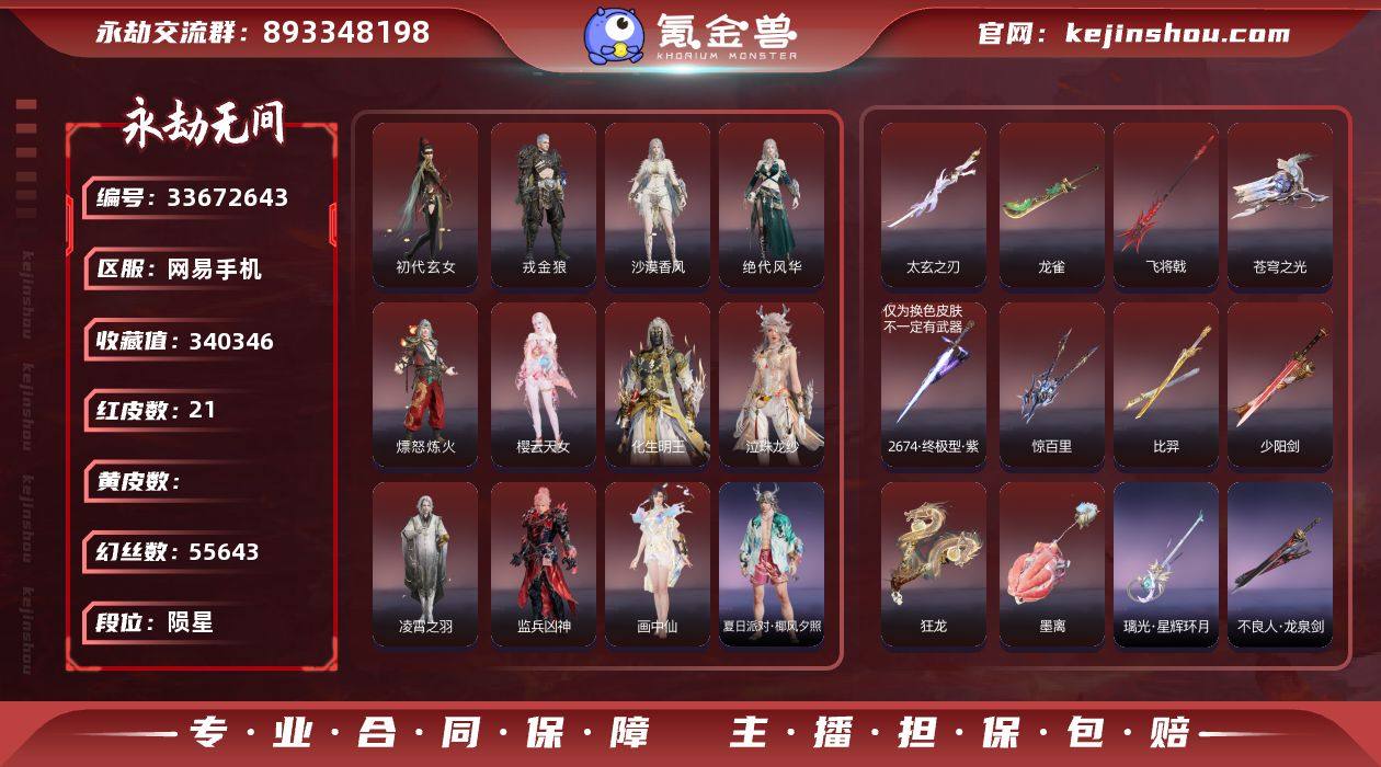【红皮】:墨离(飞索皮肤),初代玄女(宁红叶皮肤),戎金狼(特木尔皮肤),绝代风华(迦南皮肤),沙漠香风(迦南皮肤),熛怒炼火(季沧海皮肤),凌霄之羽(无尘皮肤),少阳剑(长剑皮肤),狂龙(双节棍皮肤),化生明王(天海皮肤),泣珠龙纱(崔三娘皮肤),飞将戟(斩马刀皮肤),监兵凶神(胡为皮肤),比羿(横刀皮肤),樱云天女(胡桃皮肤),惊百里(双戟皮肤),2674·终极型·紫(长剑皮肤),苍穹之光(五眼铳皮肤),画中仙(蓝梦皮肤),龙雀(阔刀皮肤),太玄之刃(太刀) 【外观总数】21红 494金 幻丝:55643金砖: 收藏值:34W 【换绑】:可换绑,期间登录网易大神不影响正常游戏,其他皮肤可参考以下截图,道具、段位以实际验号为准,段位因赛季原因发生变化,以上号为准"