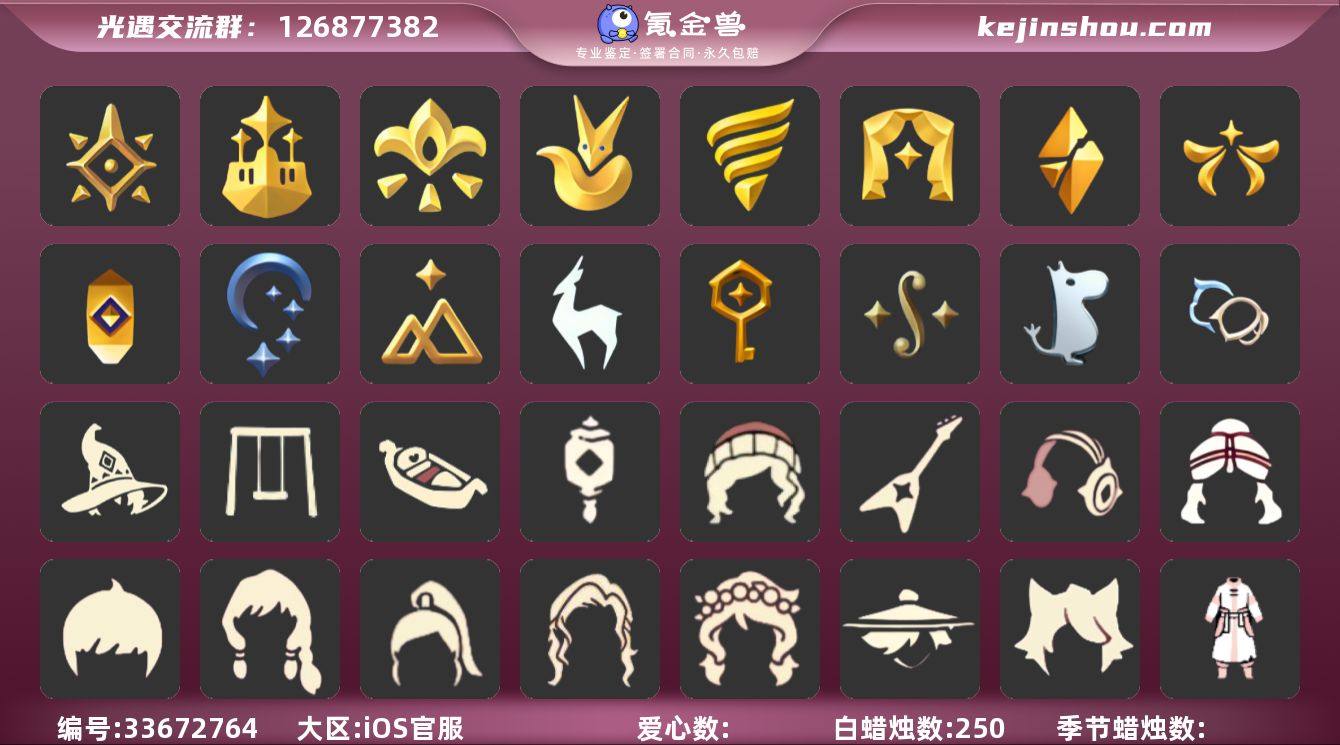 17季蝙蝠玫瑰阿努比斯白枭巫师欧声绊爱 区服:苹果 翼数量:127 蜡烛:250 爱心:836 红蜡:1 已毕业地图:晨岛 云野 雨林 霞谷 暮土 禁阁 毕业季节:预言季 梦想季 集结季 小王子季 潜海季 表演季 破晓季 欧若拉季 追忆季 夜行季 拾光季 九色鹿季 筑巢季 二重奏季 姆明季 双星季 迁徙季 热门礼包:阔腿牛仔裤 连衣裙 兔子拖鞋 雪人靴 小黄鸭斗 瑞气服饰 暗彩服饰 皮皮猫斗 姆明尾巴 猫咪尾巴 彩虹帽 蝙蝠套 巫师帽 双马尾 绊爱套 小狗发箍 爱心发饰 绿绒卷耳 粽子发箍 小黄鸭发饰 星月王冠 金鳞耳坠 彩虹耳坠 彩虹耳机 女巫犄角 圣诞鹿角 网易耳机 小王子围巾 暗陨斗 铜钱斗 蜘蛛斗 瑞雪斗 白雪斗 暖冬围巾 音韵吉他 欧若拉之声 中秋灯笼 秋千 花憩茶桌 小船 皮皮猫背饰 冥龙南瓜 热门复刻:背带裤 彩虹链带 白棉裤 毛靴棉裤 搓澡巾 灯笼裤 紧身棉裤 工装裤 连体衣 武士裤 白毛绒裤 击剑连体衣 过膝长袍 小丑睡衣 狐狸面具 鼬鼠面具 老爷爷面具 修行面具 玫瑰花面具 圣诞铃铛 兔子尾巴 斗笠 蝴蝶结发型 公主头 粗辫 书虫 总裁头 正太 高马尾 明制帽 郡主 箬笠 花环 虚荣 平顶帽 猫猫头 圆环发辫 半扎马尾 樱花发型 猫耳发型 单片羽毛 花环发饰 红耳机 断角发饰 飘带耳...