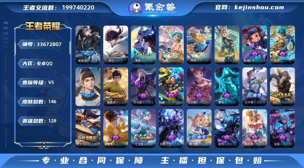 【精品推荐·鹤羽星尊·诗剑行·谪仙醉月·猎兽之王·无限星赏官·无二次包过】YXw25554-安卓Q-128英雄-146皮肤-5王者印记-186铭文-贵族积分1w【贵族5】【2传说·1按键·218幸运值】【因赛季更新游戏段付以上号为准!】 【英雄全皮】:孙权全皮,敖隐全皮 【传说皮肤】:诸葛亮鹤羽星尊,李白诗剑行 【限定皮肤】:姜子牙天穹之誓,李白谪仙醉月,狄仁杰阴阳师,赵云皇家上将,墨子神迹守卫,扁鹊奇幻香踪,吕布猎兽之王,夏侯惇朔风刀,狄仁杰魔术师,狄仁杰万华元夜,项羽海滩派对,老夫子醍醐杖,老夫子航海奇遇记,程咬金演武夺筹,钟馗驱傩正仪,杨戬潮玩骑兵,雅典娜单词大作战,蔡文姬繁星吟游,鬼谷子原初探秘者,诸葛亮鹤羽星尊,弈星混沌棋,明世隐疑决卦,裴擒虎李小龙,裴擒虎擒涛扼浪,云中君纤云弄巧,盾山御銮,上官婉儿梁祝,蒙犽狂想玩偶喵,鲁班大师探海日志,桑启海盐诗旅,艾琳女武神,蒙恬荣光圣徽,鬼谷子天穹祈灯,刘邦剑破天穹,周瑜熔金海岸 【赛季限定】:盾山御銮,夏侯惇朔风刀,弈星混沌棋,明世隐疑决卦,老夫子醍醐杖,鬼谷子原初探秘者,狄仁杰万华元夜,程咬金演武夺筹,钟馗驱傩正仪,桑启海盐诗旅,裴擒虎擒涛扼浪,鲁班大师探海日志,鬼谷子天穹祈...