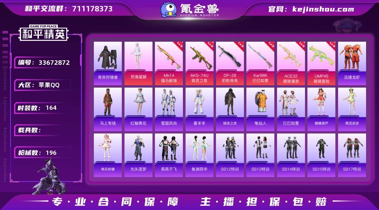 W16222 可立即换绑无需挂单养号 苹果 手Q-1粉装-6特效枪-0载具-1粉色飞行器-55452热力值-22王牌印记-164套装-196枪皮 【热门品类】:套装-奇异狩猎者,套装-暗夜之虎,套装-龟仙人 【粉色套装】:角色-荧海星豚 【粉色枪皮等级】:ACE32-萌骑漫游(四级),UMP45-萌骑冒险(四级),AKS-74U-森灵之息(五级),Kar98K-巳巳如意(五级),Mk14-福马献瑞(五级),DP-28-豹影疾电(五级) 【粉色枪皮】:ACE32-萌骑漫游,UMP45-萌骑冒险,AKS-74U-森灵之息,Kar98K-巳巳如意,Mk14-福马献瑞,DP-28-豹影疾电 【粉色飞行器】:炫彩糖果飞行器 【粉色降落伞】:绝对恒星降落伞,金风玉露降落伞,王牌四分卫降落伞,月影灵韵降落伞,极意拳锋降落伞,炫彩糖果降落伞,鸢尾珑雾降落伞 【稀有套装】:套装-龟仙人,套装-巳巳如意,套装-雪国风尚,套装-炫彩糖果,套装-马上有钱,套装-迅捷龙虾,套装-糖糖葫芦,套装-青团波波,套装-棉花软糖,角色-光矢逐梦,套装-燕燕于飞,套装-鱼渊荷华,玩偶服-喜羊羊,套装-雨过天青,套装-红釉青花 【稀有枪皮】:AKM-夜灯,AKM-彩虹符号,AKM-灼热熔岩,AKM-破晓战魂,AKM-萌趣颜团子,AKM-虎虎生威,AKM-霓虹街区,M16A4-夜灯,M16A4-幻世战舞者,M16A...