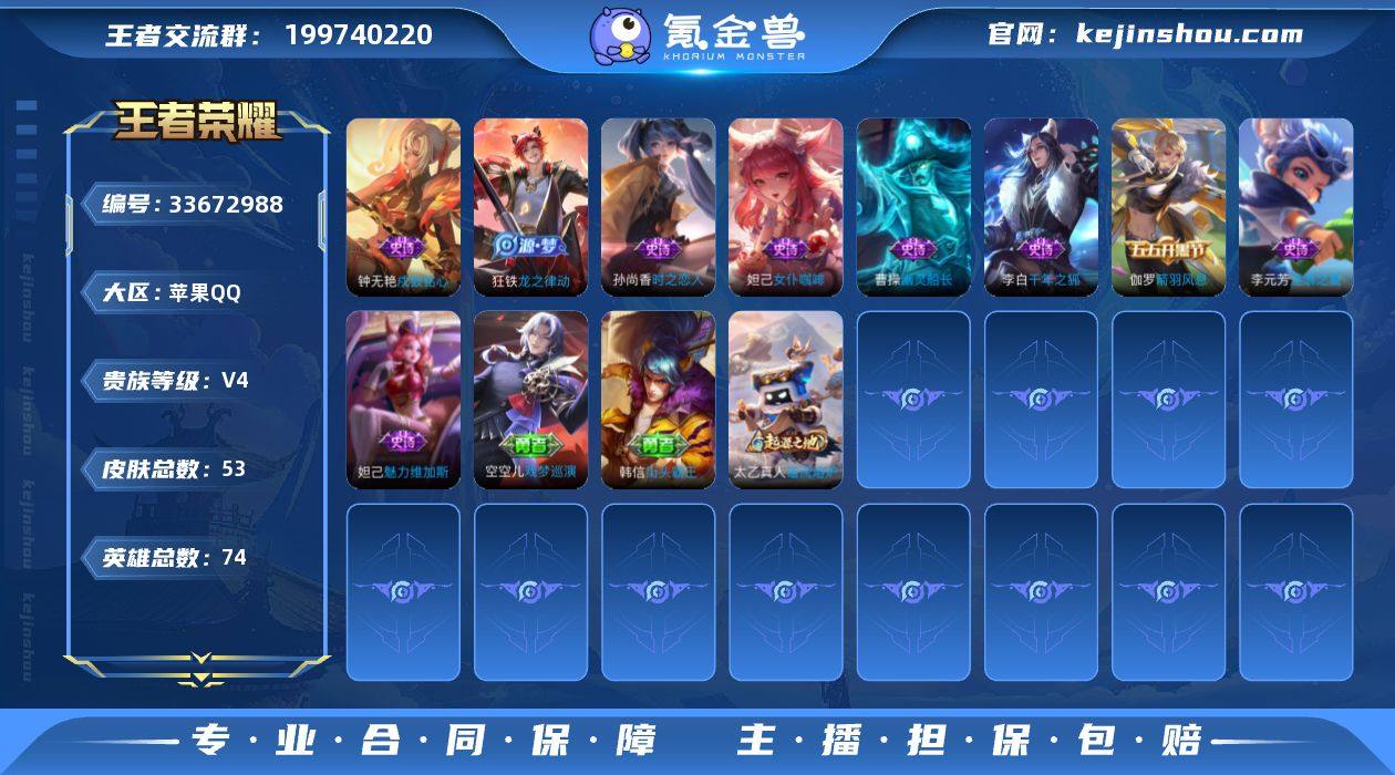 -V4-至尊星耀IV段位-74英雄-53皮肤-1传说-11史诗 【英雄全皮】:空空儿全皮 【传说皮肤】:妲己愿照众生和 【限定皮肤】:狄仁杰阴阳师,项羽海滩派对 【年限皮肤】:妲己愿照众生和【商品标题】:苹果Q-Vundefined-至尊星耀IV-74英雄-53皮肤-0典藏-0无双-0珍品传说-1传说-10史诗 【稀有英雄】 橘右京 韩信 艾琳 赵云 【传说皮肤】 愿照·众生和 【史诗皮肤】 龙之律动 戍鼓铭心 魅力维加斯 女仆咖啡 逐浪之夏 千年之狐 节奏热浪 箭羽风息 时之恋人 幽灵船长 【勇者皮肤】 大发明家 沉稳之力 幻泉雾影 黄金武士 阴阳师 海滩派对 哥特玫瑰 戏梦巡演 阿尔法小队 玩偶对对碰 掌控之力 兔女郎 花好人间 街头霸王 谧流熔炉 灵卦秘语 【其他皮肤】 芝加哥教父 极冰防御线 万圣前夜 灼热之刃 木偶奇遇记 福禄兄弟 星航指挥官 启蛰 异域舞娘 激情绿茵 尼罗河女神 归虚梦演 西部大镖客 绝影神枪 森 圆桌骑士