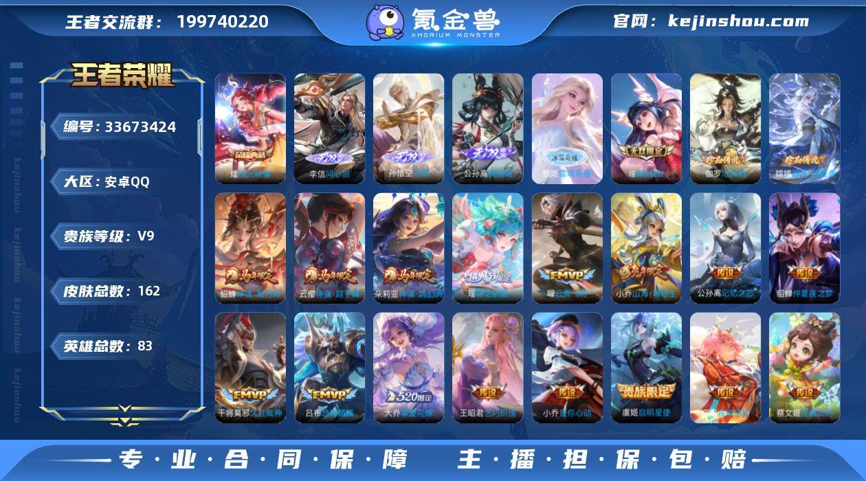 女号安卓手Q507区162皮1典藏18传说5无双2珍品传说V9 营地ID1552947162非凡王者【珍品传说皮肤】:器灵·落星盏,沧流箭【无双皮肤】:离恨烟,问心剑,雪境奇遇,无相,瑶真我赫兹【荣耀典藏】:拾光映像【优质限定皮肤】:瑶时之祈愿,山海·琳琅生【传说皮肤】:神骥·越千峰,灼幽烈阳,瑶时之祈愿,挚爱花嫁,神骥·聚万邦,神骥·鸣幻洲,久胜战神,黄金白羊座,记忆之芯,云鹰飞将,山海·琳琅生,花朝如约,仲夏夜之梦,乞巧织情,音你心动,启明星使,牧神诗旅,怒海麟威【史诗皮肤】:星夜王子,瓦猫非猫,夜都魔契,幽灵船长,百晓客,猫狗日记,百里守约真我赫兹,偶像歌手,鬼剑武藏,镜真我赫兹,银翎春语,遇见神鹿,线条小狗,逐浪之夏,金属风暴,未来纪元,乘风破浪,电玩小子,热情桑巴,黄金分割率,无限星赏官,摇滚巨星,乱世虎臣,时之恋人,修罗,舞动绿茵,天才门将,光弋星穹,圣诞狂欢,特工魅影,千年之狐,冰冠公主,魔术师,水果甜心,皇家上将,末日机甲,女仆咖啡,魅力维加斯