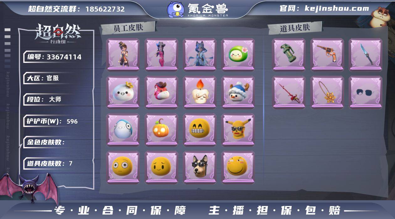 紫皮3;道具皮7;皮肤:阿念-庆宴绮愿,爱丽丝-耀眼的你,小黄-青丘一梦;道具:摸金符-花落精绝,转轮手枪-新星时代,闪光弹-金戈玄铜,急救包-蔷薇物语,桃木剑-绯色遗证,刺刀-青瓷,夜视仪-金丝眼镜;饰品:头饰-惊魂南瓜头套,头饰-烛光纪念,头饰-哈士奇头套,头饰-太空鲨头套,头饰-雪墩墩头套,头饰-龙傲天头套,头饰-萨卡班甲鱼头套,头饰-滑稽头套,头饰-呆滞头套,头饰-青团糯糯,头饰-烈焰红唇头套,头饰-咬咬鲨头套,头饰-鱼头怪头套,头饰-卑微头套,头饰-面具马头套,头饰-芝麻糊汤圆,头饰-马上有钱,头饰-嘻嘻头套,头饰-蒜了八,头饰-哞哞牛头套,头饰-伤心蛙头套,头饰-粽小宝头套,头饰-像素朋克墨镜,头饰-后室幸存者头套,挂饰-春信香囊,背饰-云梦之星,背饰-扭扭仙人掌,背饰-牛啤背包;动作:动作-小雨摇,动作-新年摇,动作-舞台中心,动作-九万字舞,动作-一点点星星摇,动作-星奇摇,动作-企鹅舞,动作-青海摇,动作-旋转舞,动作-要糖,动作-拜年,动作-晚安公主舞,动作-抬手,动作-举牌;工牌背景:工牌背景-舞台终演,工牌背景-流金照庭,工牌背景-鸢尾花,工牌背景-童话扉页;工牌动作:工牌动作-蜕变,工牌动作-春色盈怀;员工:小黄,员工-月,员工-莉莉,员工-爱德华,员工-阿念,员工-兰,员工-逍遥...