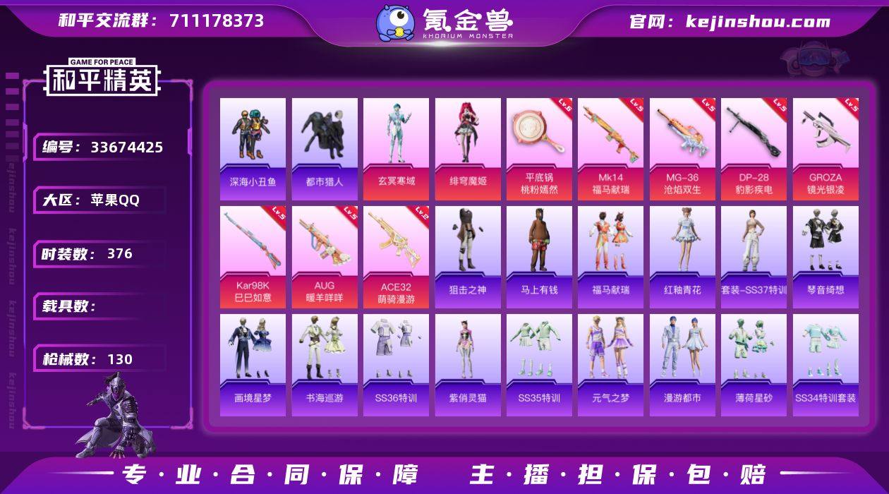 实名: 可修改 时装数: 376 枪械数: 130 战备数: 93 热门装扮: 呆萌铁蟹,深海小丑鱼,鹰眼刺客,都市猎人,玄冥寒域,绯穹魔姬 稀有枪皮: 黄金龙骨AWM,GROZA-镜光银凌,Kar98K-巳巳如意,AUG-暖羊咩咩,平底锅-桃粉嫣然,DP-28-豹影疾电,MG-36-沧焰双生,ACE32-萌骑漫游