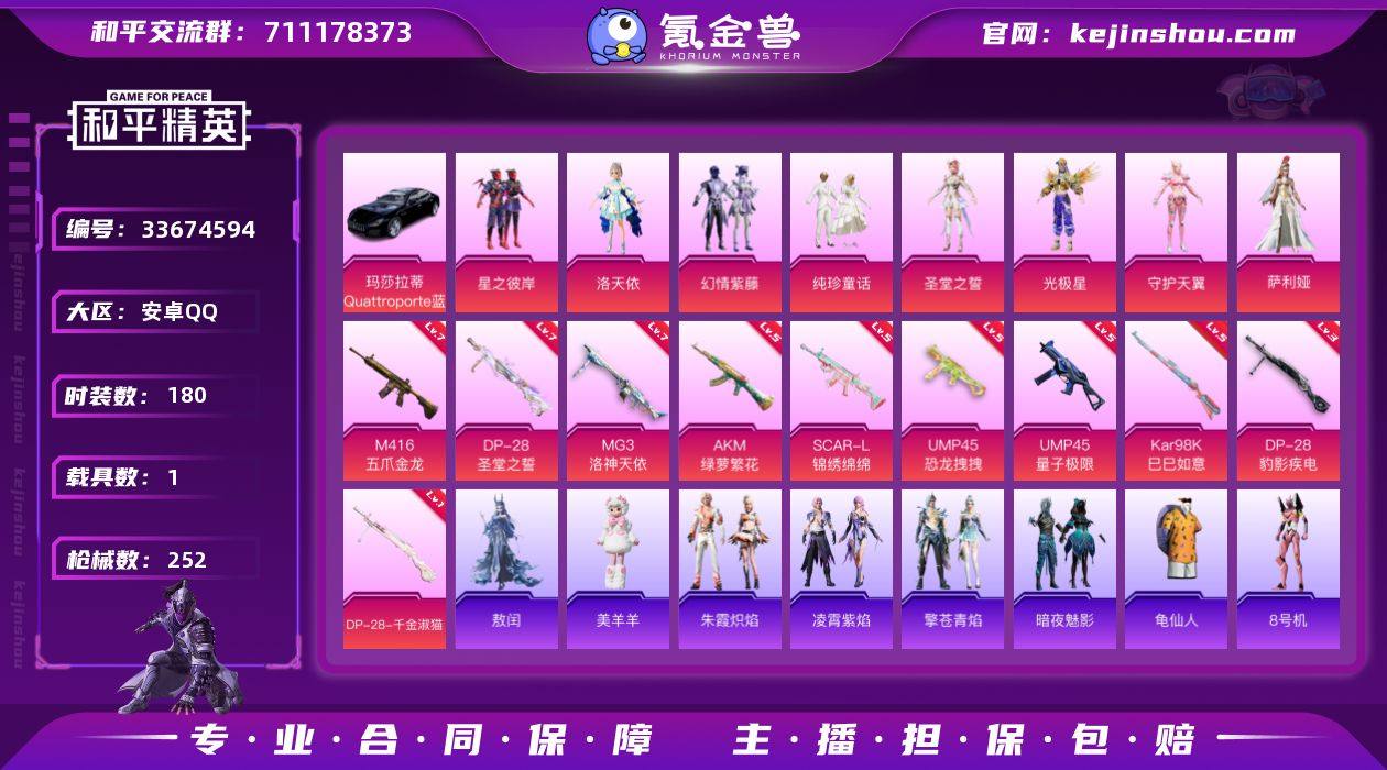 J3398 【精品号】8粉 10特 1载 洛天依 星之彼岸 纯珍童话 守护天翼 萨利娅 圣堂之誓 满级枪*8 地铁满天赋 收藏家等级73 安卓 手Q-8粉装-10特效枪-1载具-6粉色飞行器-85289热力值-20王牌印记-180套装-252枪皮 【热门品类】:套装-龟仙人,角色-8号机,角色-Mark.06 【粉色套装】:粉装-星之彼岸,角色-洛天依,粉装-幻情紫藤,粉装-纯珍童话,角色-圣堂之誓,角色-光极星,角色-守护天翼,角色-萨利娅 【粉色枪皮等级】:AKM-绿萝繁花(五级),SCAR-L-锦绣绵绵(五级),M416-五爪金龙(七级),UMP45-恐龙拽拽(五级),UMP45-量子极限(五级),Kar98K-巳巳如意(五级),DP-28-圣堂之誓(七级),DP-28-千金淑猫(一级),DP-28-豹影疾电(三级),MG3-洛神天依(七级) 【粉色载具】:玛莎拉蒂Quattroporte(夜幕蓝) 【粉色枪皮】:AKM-绿萝繁花,SCAR-L-锦绣绵绵,M416-五爪金龙,UMP45-恐龙拽拽,UMP45-量子极限,Kar98K-巳巳如意,DP-28-圣堂之誓,DP-28-千金淑猫,DP-28-豹影疾电,MG3-洛神天依 【粉色飞行器】:炫彩糖果飞行器,繁龙极客飞行器,凤舞九天飞行器,圣域金龙飞行器 【粉色降落伞】:绝对恒星降落伞,暗夜玫瑰降落伞,洛神天依降落伞,天之羽翼降落伞,环太平洋降落伞,圣堂...