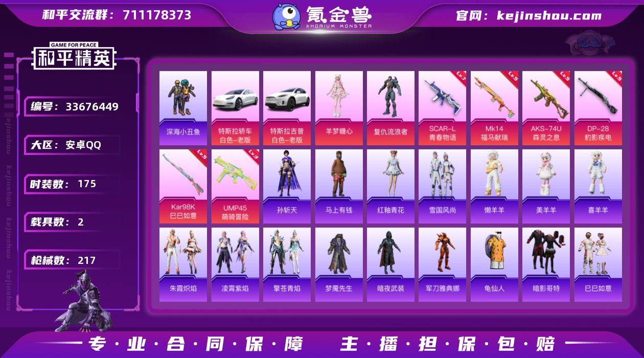 【店主推荐捡漏号】安卓 手Q-2粉装-6特效枪-2载具-1粉色飞行器-68199热力值-13王牌印记-175套装-217枪皮【热门品类】:套装-深海小丑鱼,角色-军刀雅典娜,套装-龟仙人,套装-暗影哥特【粉色套装】:角色-复仇流浪者,角色-羊梦糖心【粉色枪皮等级】:SCAR-L-青春物语(七级),UMP45-萌骑冒险(三级),AKS-74U-森灵之息(五级),Kar98K-巳巳如意(五级),Mk14-福马献瑞(五级),DP-28-豹影疾电(五级)【粉色载具】:特斯拉Model 3(珍珠白),特斯拉Model X(珍珠白)【粉色枪皮】:SCAR-L-青春物语,UMP45-萌骑冒险,AKS-74U-森灵之息,Kar98K-巳巳如意,Mk14-福马献瑞,DP-28-豹影疾电