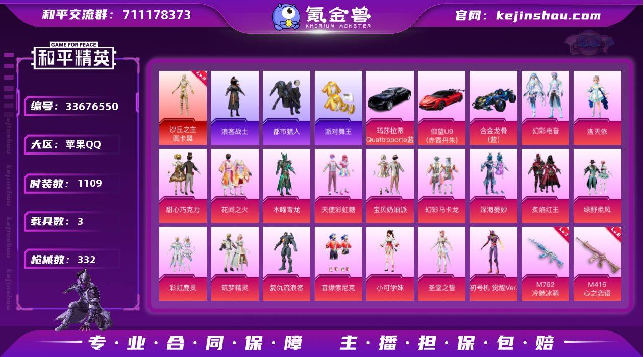 DB2614 苹果Q区 可改实名可转区 16印记1绝世 1红18粉9枪3车1升级飞行器(带王者381皮2典藏15传营地) 3级图卡盟-觉醒螳螂-巧克力-都市-金鞋-蓝粉螳螂-哥特-天命-波比-狂鲨 P90-沙丘之主-3级-UMP45-相思残雪-5级-M416-心之恋语-5级-SCAR-L-纯梦嫁纱-5级 蓝玛莎拉蒂-仰望U9-蓝合金龙骨-1级天马飞行器 苹果手Q-16王牌印记-1红装-18粉装-9特效枪-3载具-热力值-282套装-332枪皮-6卓越印记-3传奇印记 【1红装】沙丘之主-图卡盟/3级 【18粉装】套装-炙焰红王,套装-甜心巧克力,套装-木曜青龙,角色-洛天依,套装-宝贝奶油派,套装-花间之火,套装-彩虹鹿灵,角色-小可学妹,套装-音爆索尼克,套装-天使彩虹糖,套装-深海曼妙,套装-筑梦精灵,套装-绿野柔风,套装-幻彩马卡龙,角色-复仇流浪者,套装-幻彩电音,角色-圣堂之誓,角色-初号机 觉醒Ver. 【9特效枪】Kar98K-巳巳如意/5级,M416-心之恋语/6级,SCAR-L-纯梦嫁纱/5级,M762-冷魅冰骑/7级,UMP45-相思残雪/5级,P90-沙丘之主/3级,Mk14-精灵梦叶罗丽/5级,AKM-绿萝繁花/5级,AUG-暖羊咩咩/5级 【15稀有紫装】都市猎人,Mark.06,8号机,派对舞王,暗影哥特,浪漫天命,雪山精英,浪漫波比,迅捷狂鲨,金羽特工,小丑鱼,龟仙人,怀庆长公主,临安公主,萌熊伴侣背包(...