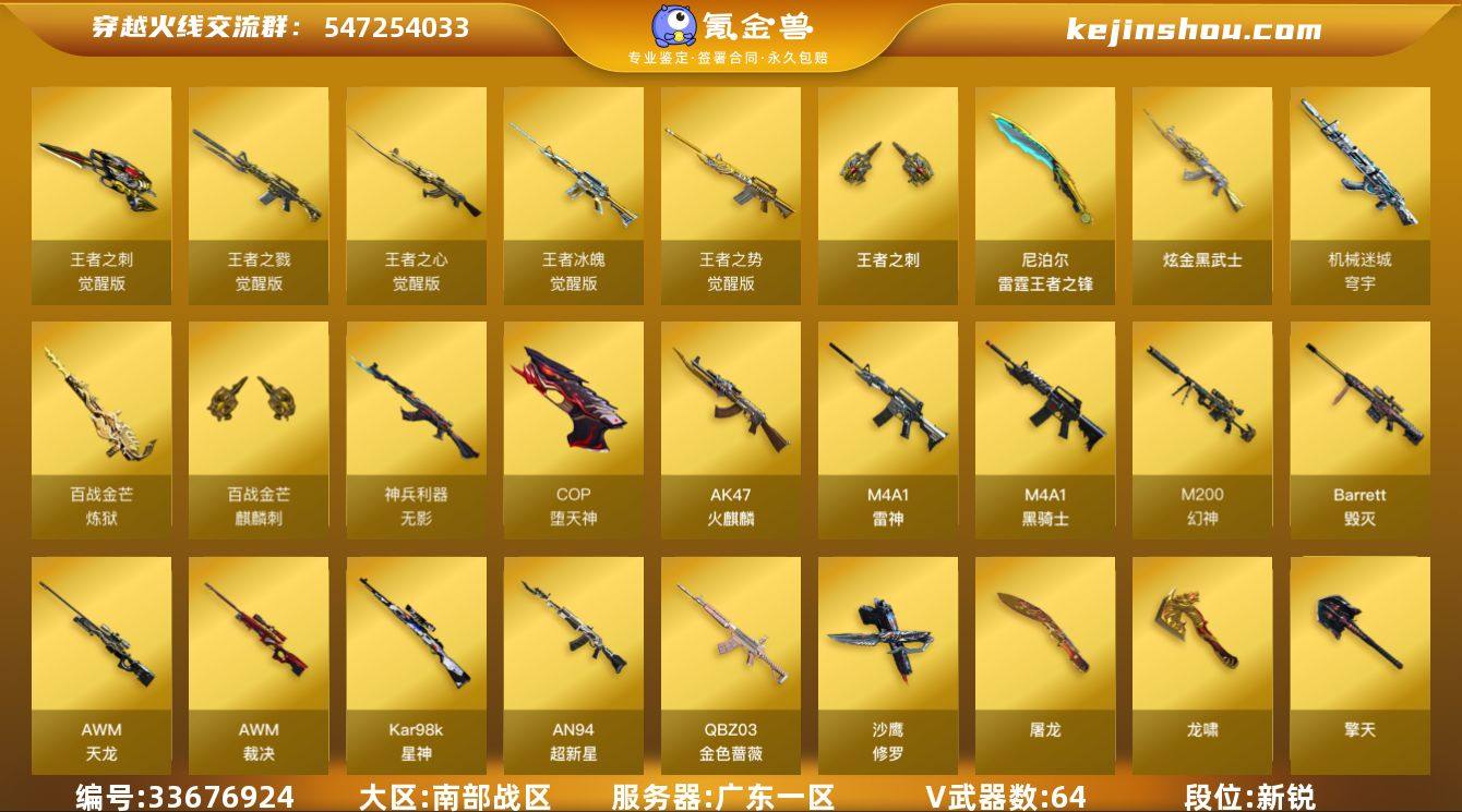 【ky6912】广东一区-79V-16王者武器数-1炫金武器数 【热门武器】:QBZ03-金色蔷薇,M200-幻神,M200-竞技荣光,死亡之眼,Kar98K-星神,M4A1-黑骑士*4,COP-堕天神,沙鹰-修罗*3 【王者炫金武器】:王者之刺,雷霆王者之锋,高爆手雷-雷霆王者*3,烟雾弹-雷霆王者*3,闪光弹-雷霆王者*3,炫金武士 【音效卡】:屠龙-电竞之星-竞星跃动音效卡,M4A1-雷神音效卡,M4A1-黑骑士音效卡,Barrett-毁灭音效卡,HK417-朱雀-电竞之星-竞星跃动音效卡,炼狱-百战金芒-庆典舞曲音效卡 【皮肤】:幻神-AG-CFPLS17冠军,幻神-纸灯龙皮肤,幻神-KZ-CFPLS25冠军 皮肤,幻神-电竞之星 皮肤,Kar98K-星神-冠军之星皮肤,星神-拼搏 皮肤,AWM-裁决-凤灵皮肤,QBZ03-荣耀世冠白鲨,雷神-耀金皮肤,雷神-机甲刑天皮肤,M4A1-再燃火线,雷神-神秘按键 皮肤,火麒麟-AG战队皮肤,火麒麟-雷神,火麒麟-百城,火麒麟-心动糖果,毁灭耀金皮肤,毁灭-黑大圣皮肤,毁灭-英雄计划 皮肤,毁灭-斗烈龙驹 皮肤,黑骑士-暗月,修罗-星空,屠龙-星耀 皮肤,龙啸-纸灯龙皮肤,轻型军用手斧-再燃火线 【角色】:零,炫,电竞教官-云悠悠,零·纪元,太空指挥官,不败狙神,乔伊教练,葵-阿尔法武装,幻面灵狐,斗烈...